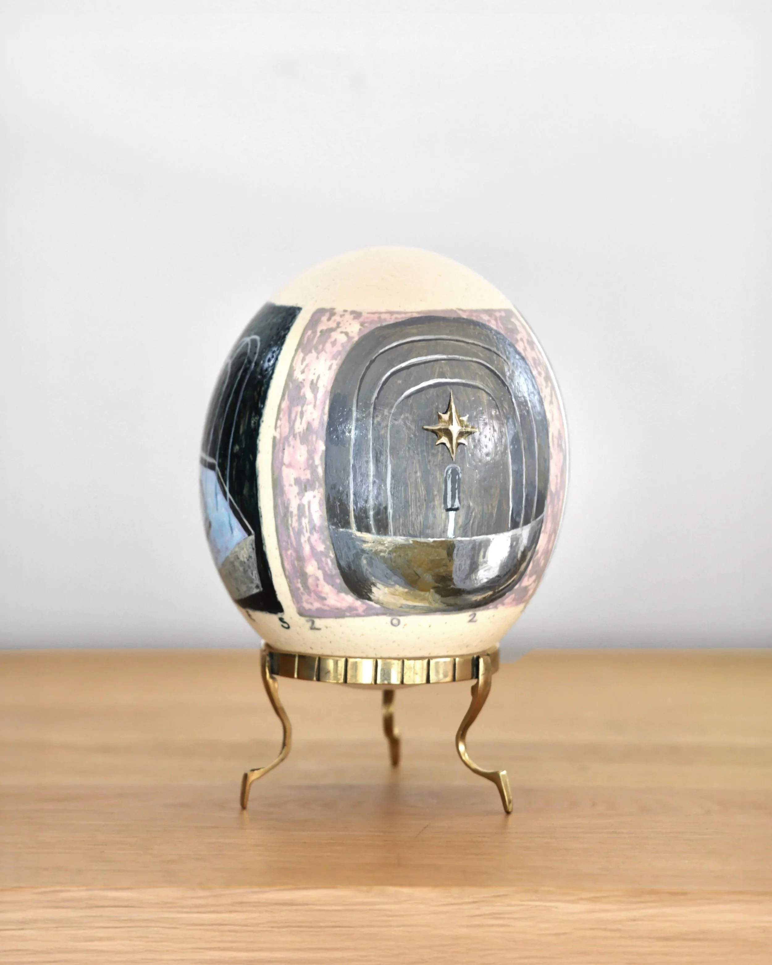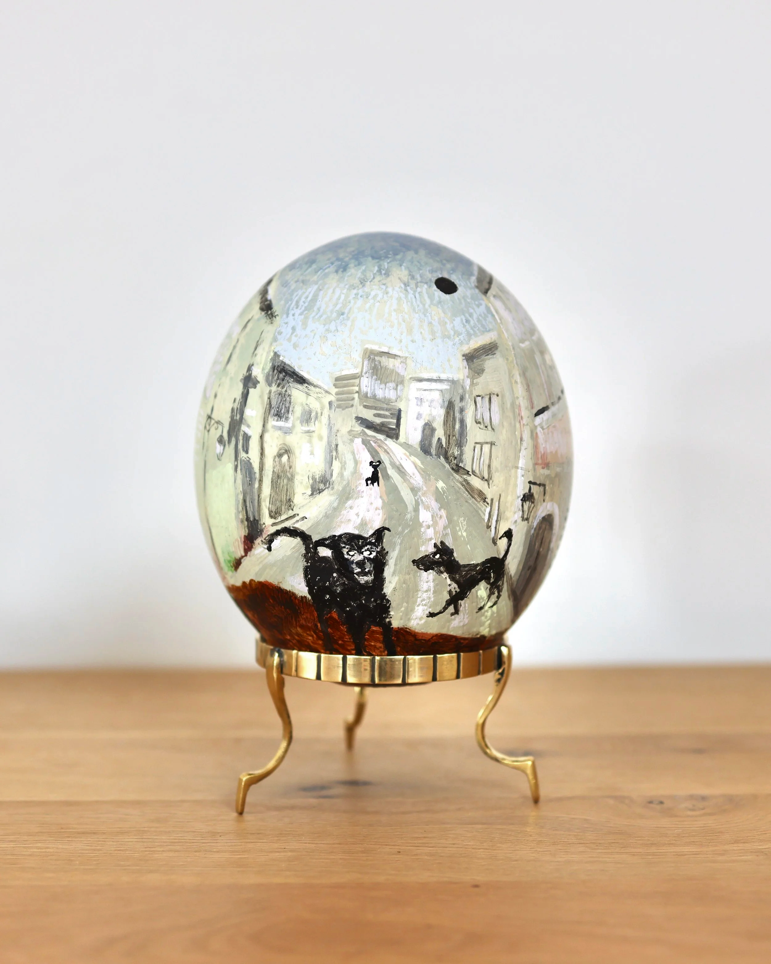 Prowlers, 4.5” x 5.5” | Acrylic on Ostrich egg on vintage brass stand. SOLD