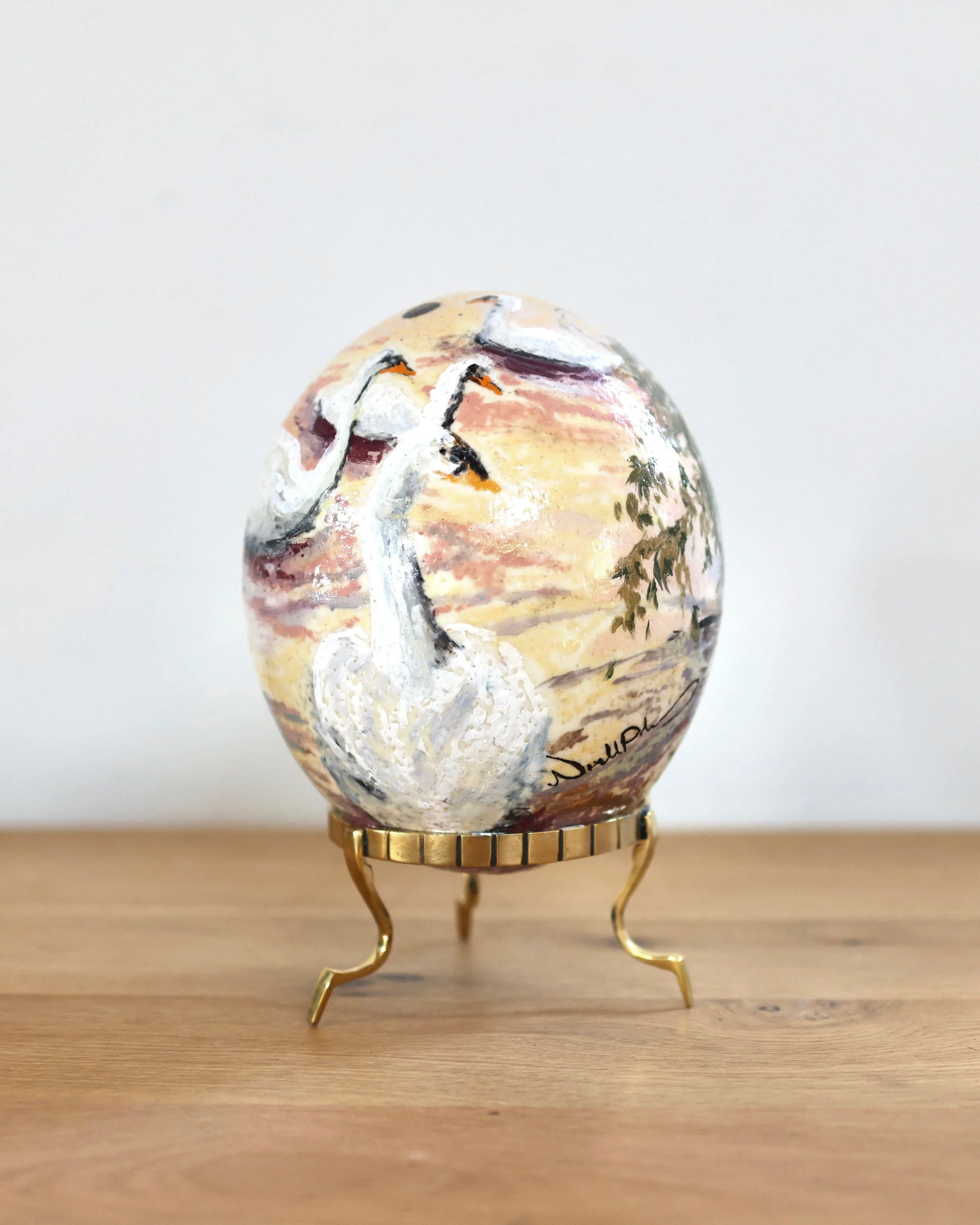 Swans of the Beguinage, 4.5” x 5.5” | Acrylic on Ostrich egg on vintage brass stand. SOLD