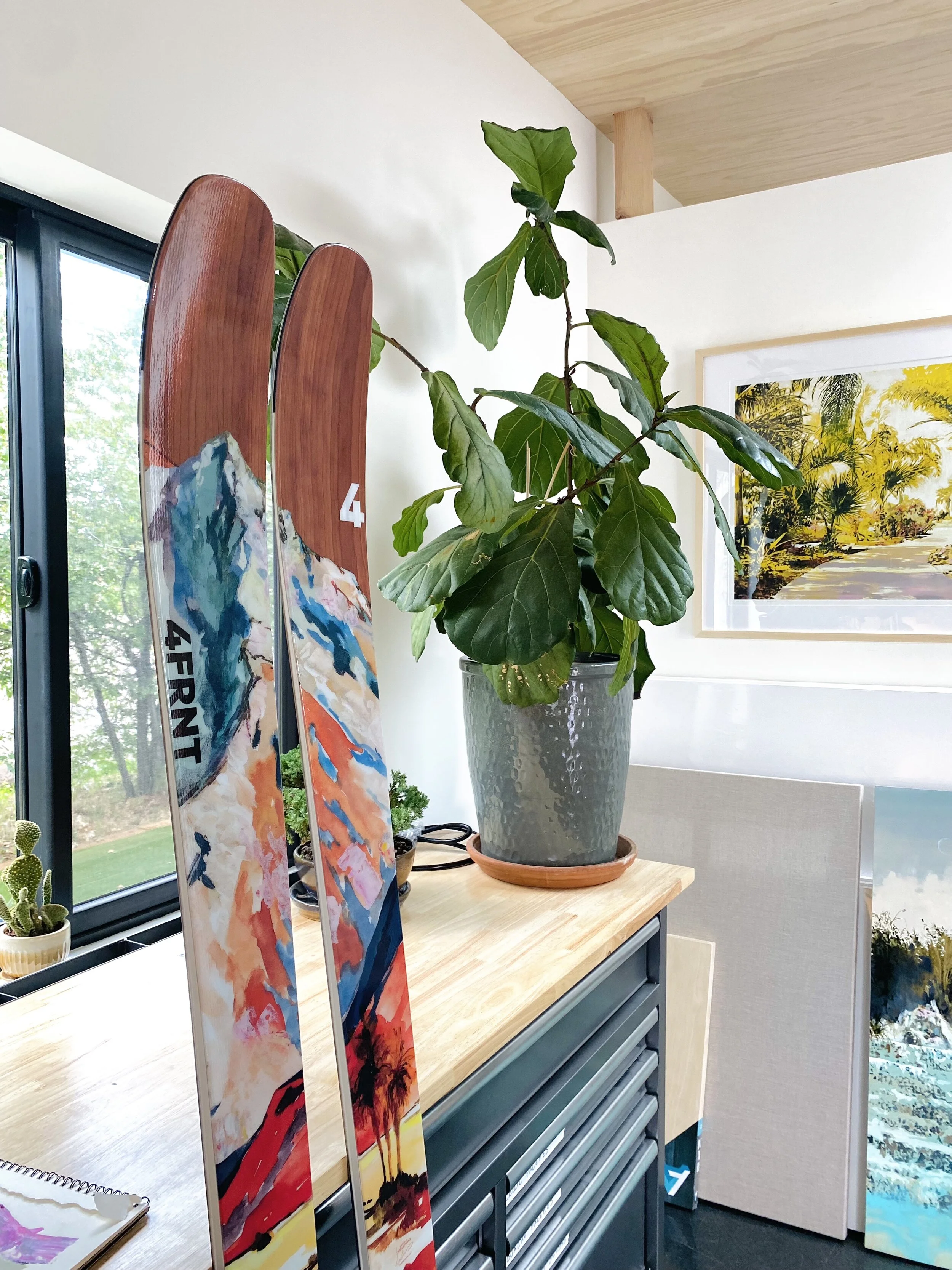 The design process began with selecting artwork. I provided the 4FRNT design team with imagery of some previously completed paintings to choose from and they narrowed it down to three different paintings - 2 on paper, 1 on canvas. From there, the 4FRNT design team translated digital imagery of these three paintings into designs that would fit the layout of their skis and we iterated on those designs together until both sides were happy with the final product.