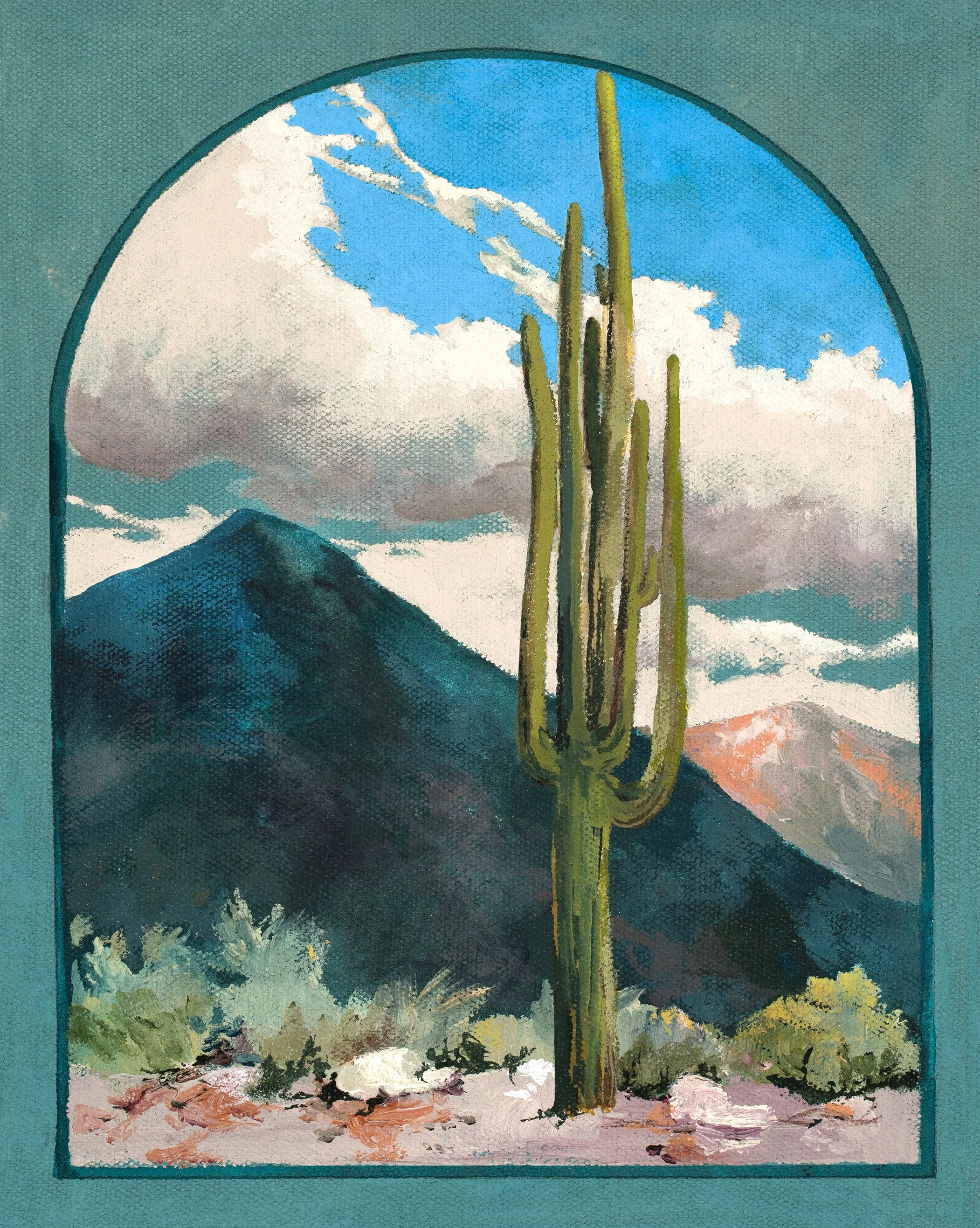 A large saguaro stands alone against a southwestern landscape in this close study of a Maynard Dixon painting. Similarly to how an encounter with an old-growth redwood forest feels, I always find it shocking to stumble upon a gigantic creature in a far-off place and realize that they’ve been living out there for ages… without us. It’s a ridiculous sentiment, but as a human it can be easy to forget that there is thriving life in the abundant silence outside of the worlds we have built. It is a refreshing reminder that we are just pieces in the vast web of life.