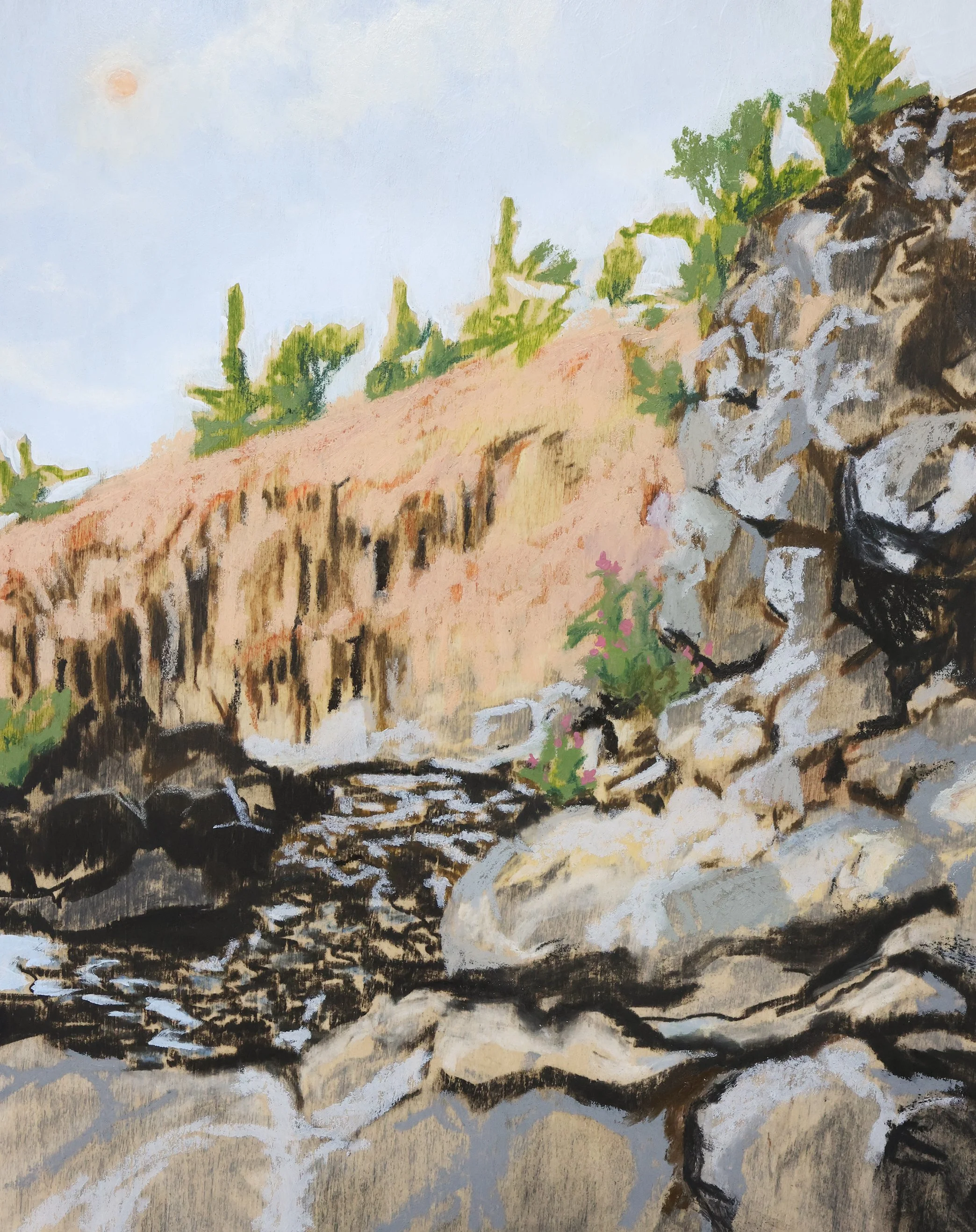 I spent an afternoon at Mosier Falls outside of Portland OR not long ago. It’s a well-visited watering hole that reminds me a lot of the canyon pools in northern California that I spent my childhood summers at. “Bedrock” is a loose depiction of that place that left us sun-baked and relaxed after a long trip.