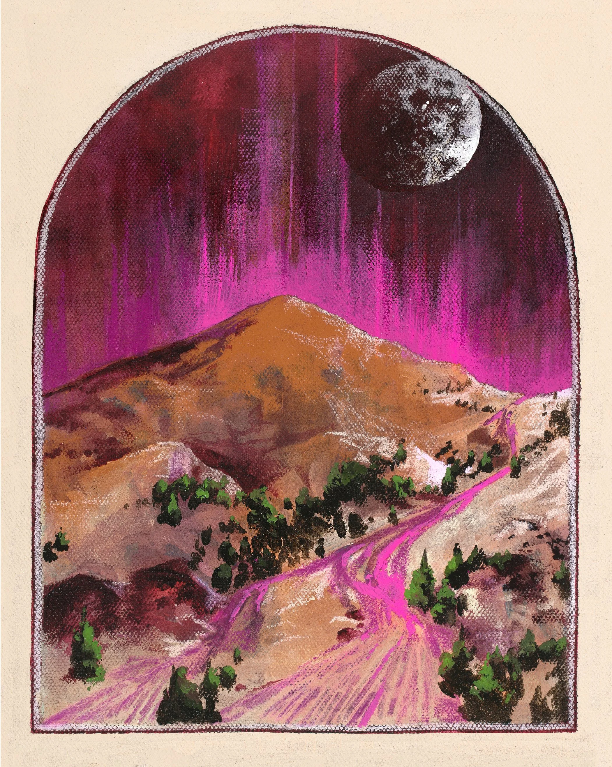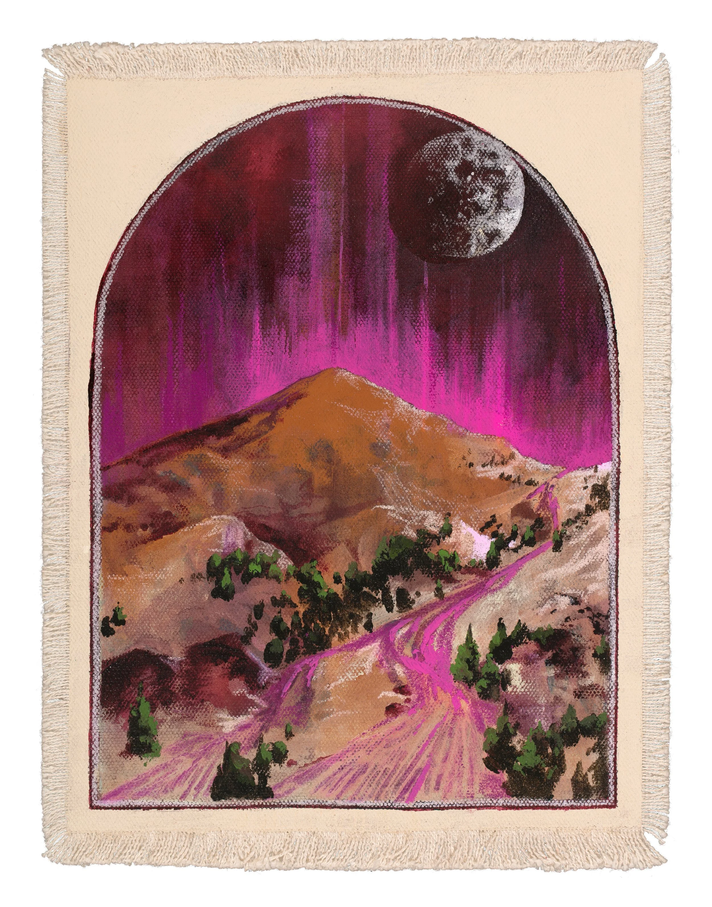 A study of color, texture, and shape - I was wishing the northern lights came in magenta under a full moon when I created this made-up mountain landscape.