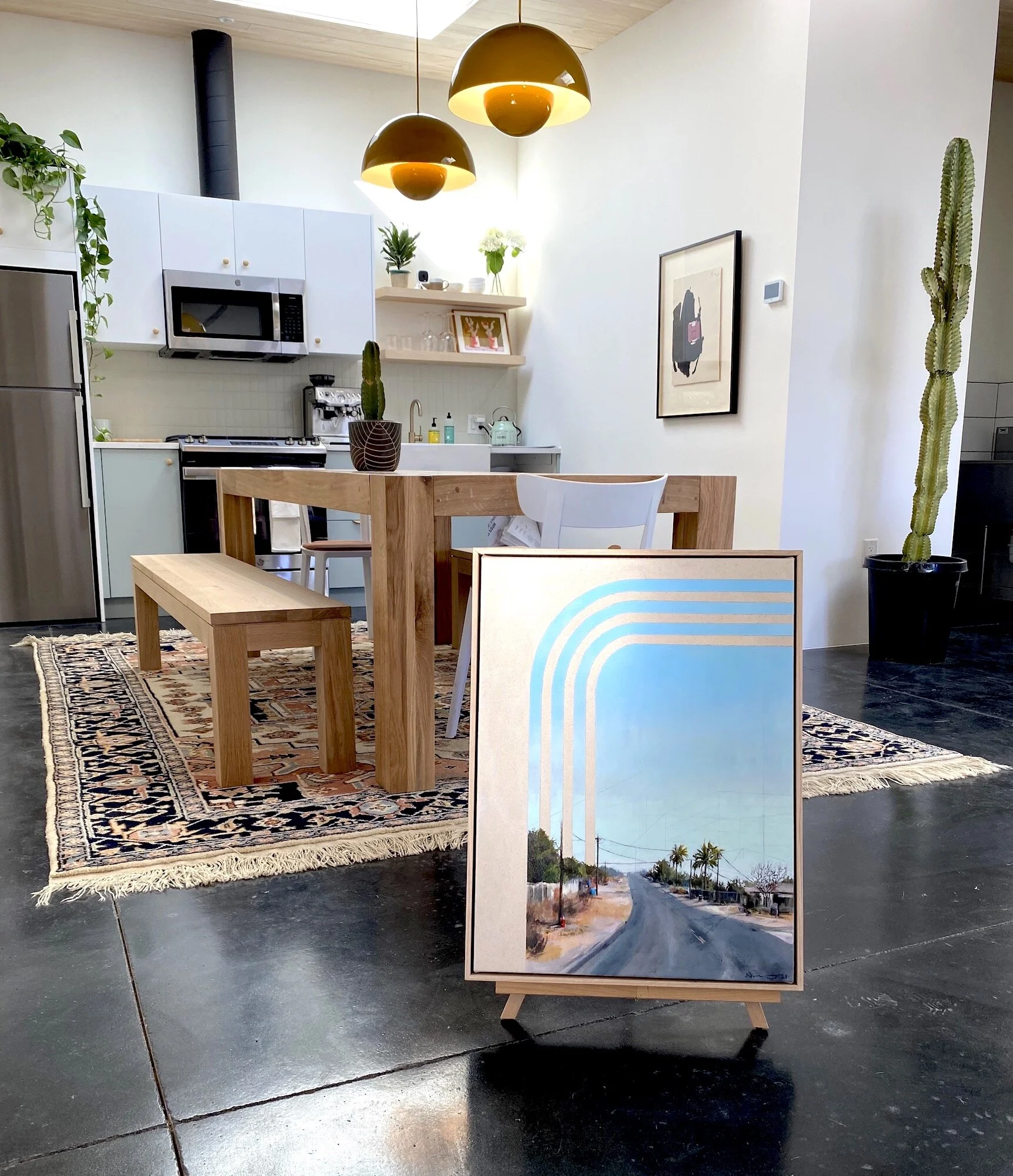 I grew up in the foothills of the Sierra Nevada mountains in California, above the central valley - the nation’s agricultural breadbasket. While so much of the state is aesthetically stunning, the central valley is less so. It was always intriguing to me how so much agricultural productivity comes out the otherwise stark, dry landscapes of this area. “Breadbasket” depicts an everyday scene from that valley. The arches symbolize the hidden beauty of what comes from here, the pot of gold at the end of the rainbow.