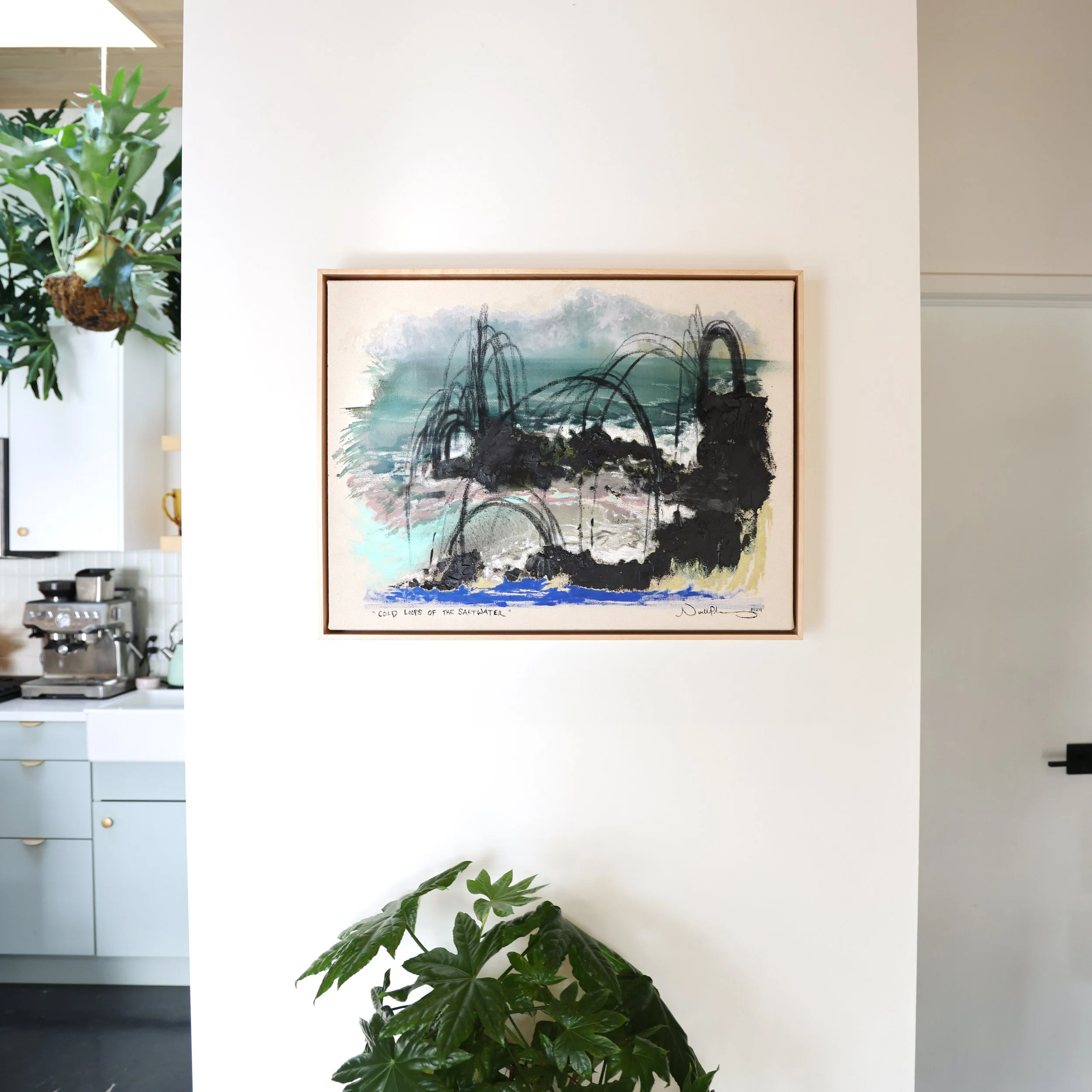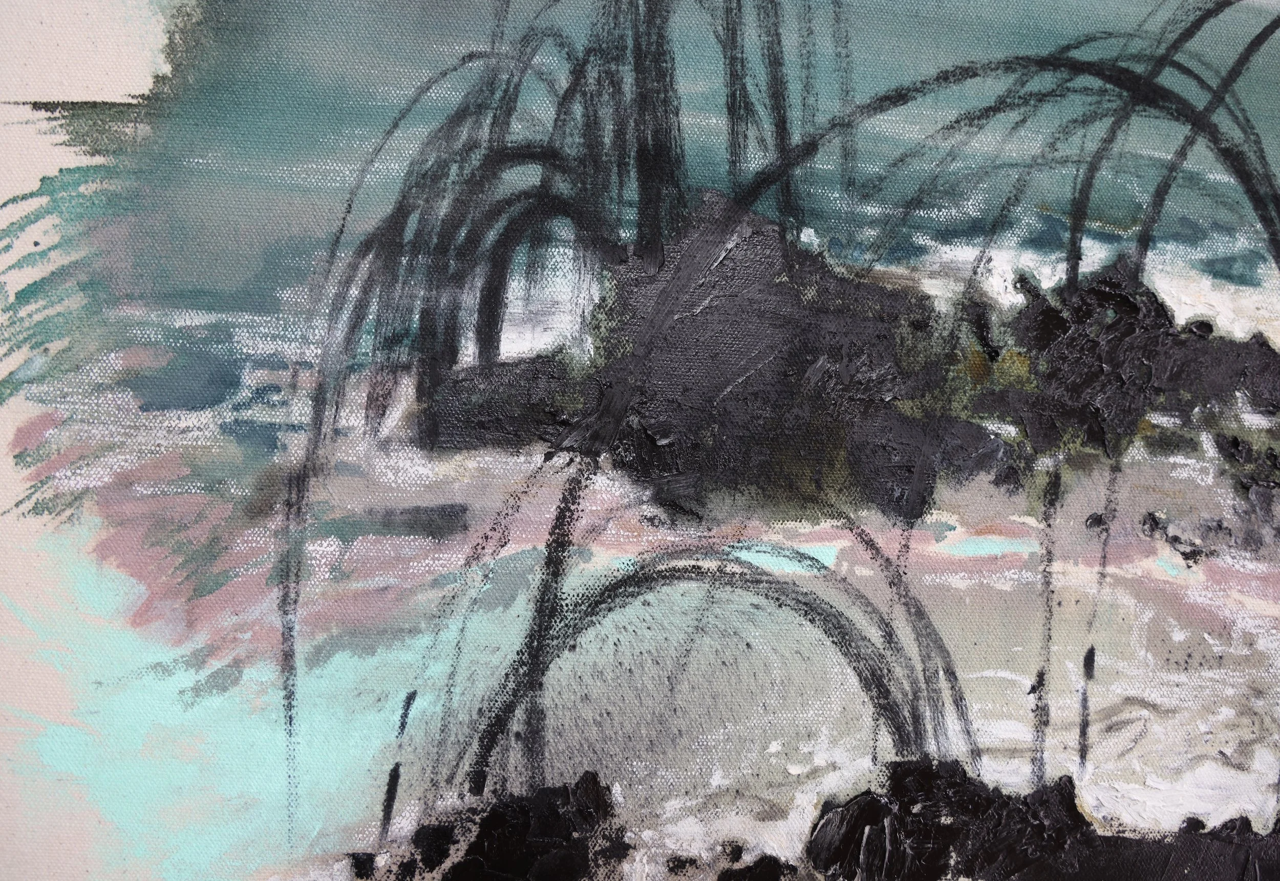 A meditation on shoreline and the loops of water, in seaspray and tidal form, that roil around in the surf. Inspired by the moody coastline of the Pacific Northwest where we spend part of the year.