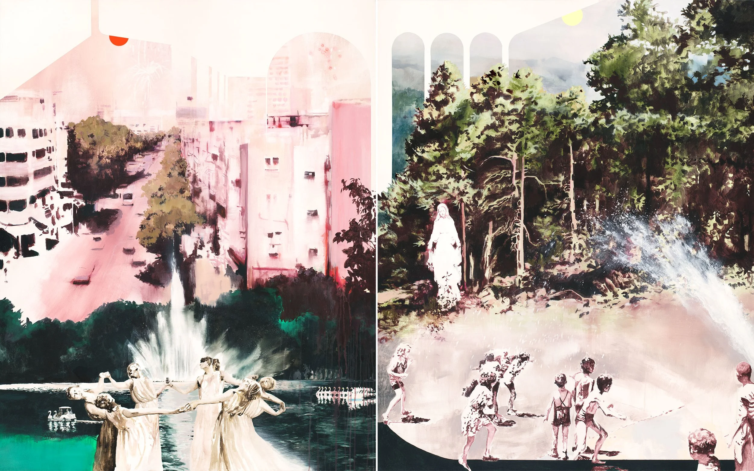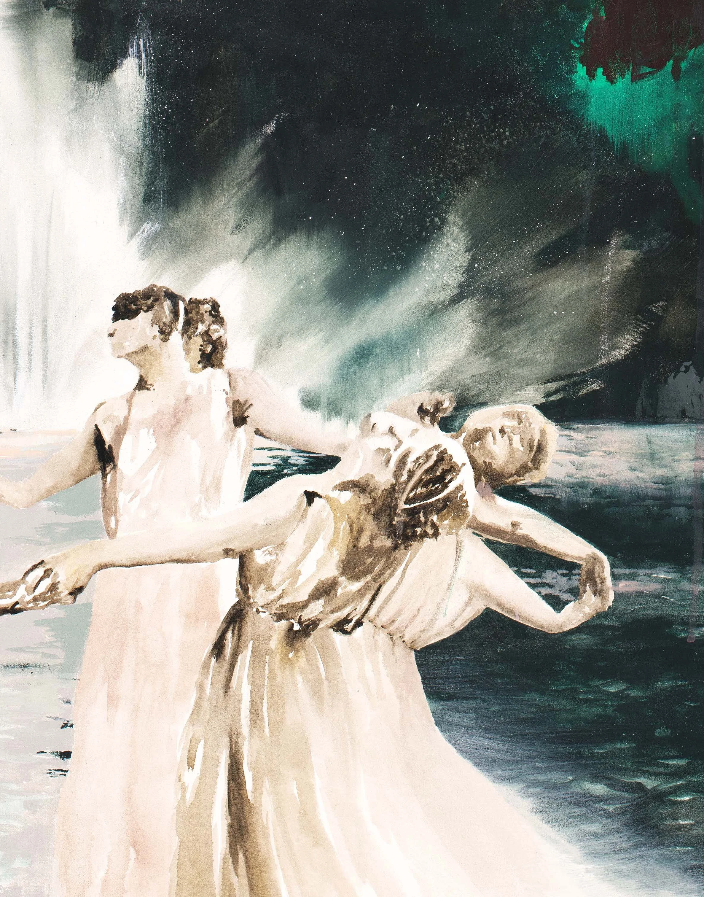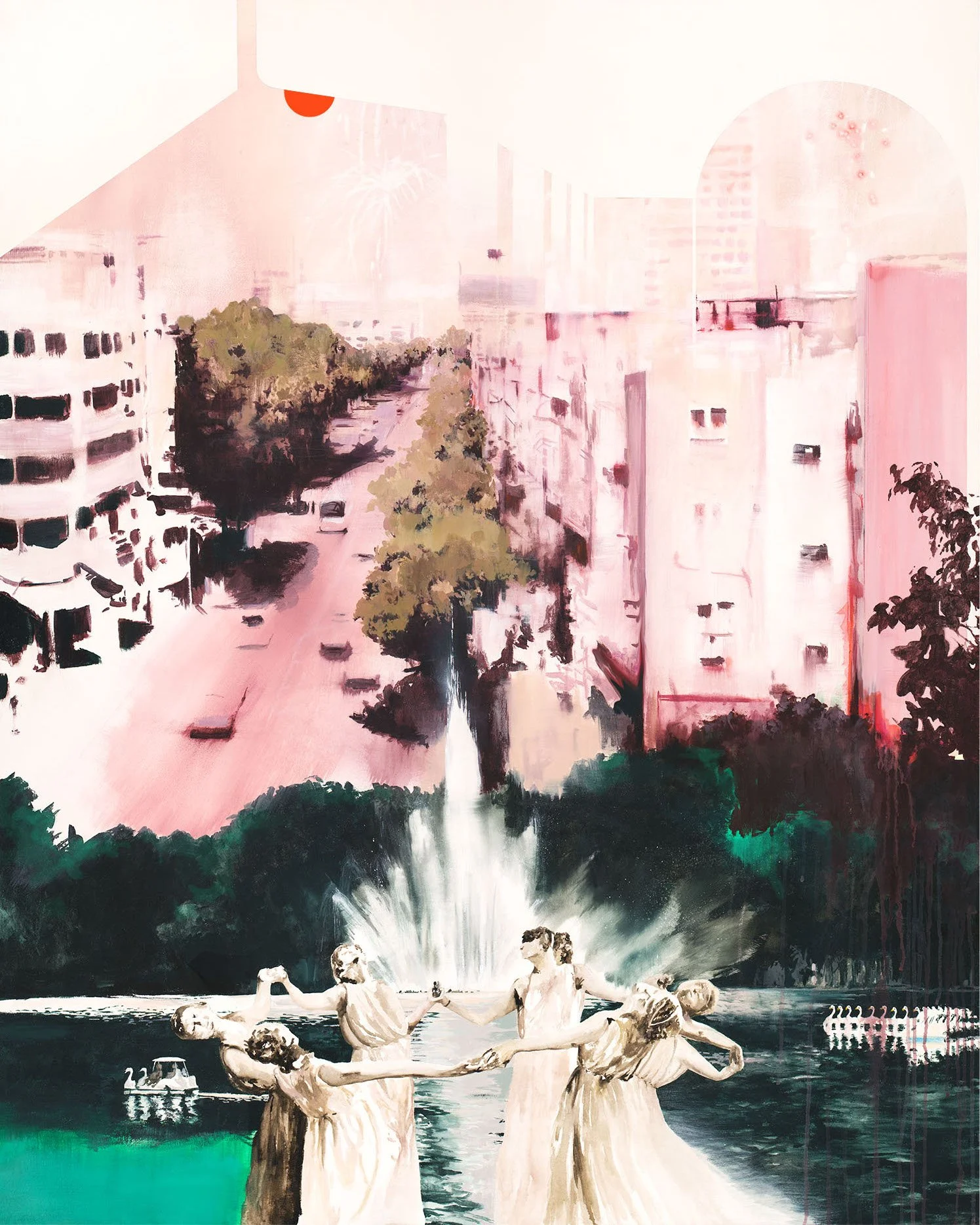 Figures revel in the miracle of water - the best remedy for a hot day. They play in the stream of a busted water main and dance in a celebratory circle under the buoyant splashes of a grand park fountain. A waxen city melts under a heavy sky hung with fireworks and a blazing sun. A ghost-like statue of the Mother Mary holds a vigil near a stand of thirsty trees, representing the gamble our species so often makes by putting our fate in the hands of higher power when s**t really starts to hit the fan. Reddish tones wash throughout the composition as even shadows provide underwhelming respite. The structural elements at the top represent our fervor for containing our worlds indoors, attempting to insulate ourselves from the reality outside. The Dog Days is an illustration of summer in the age of climate change.