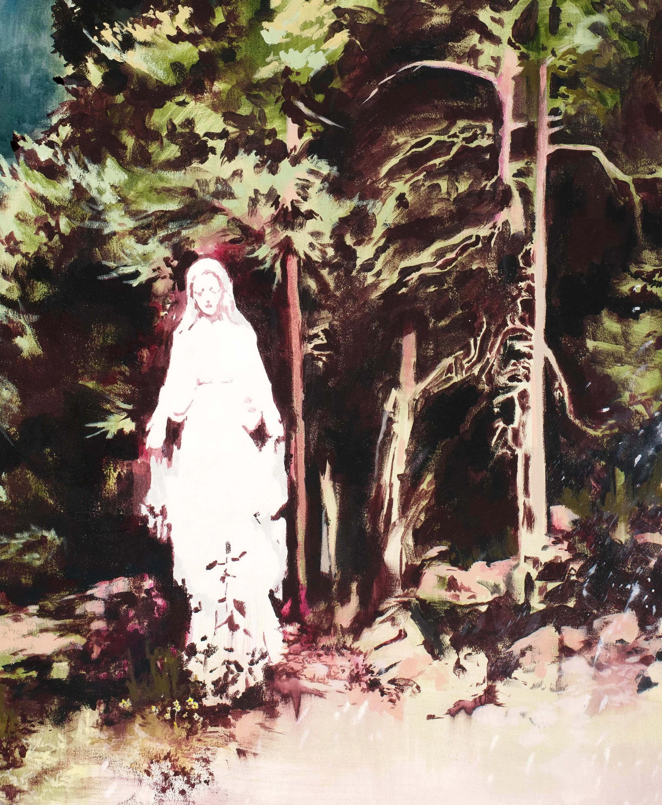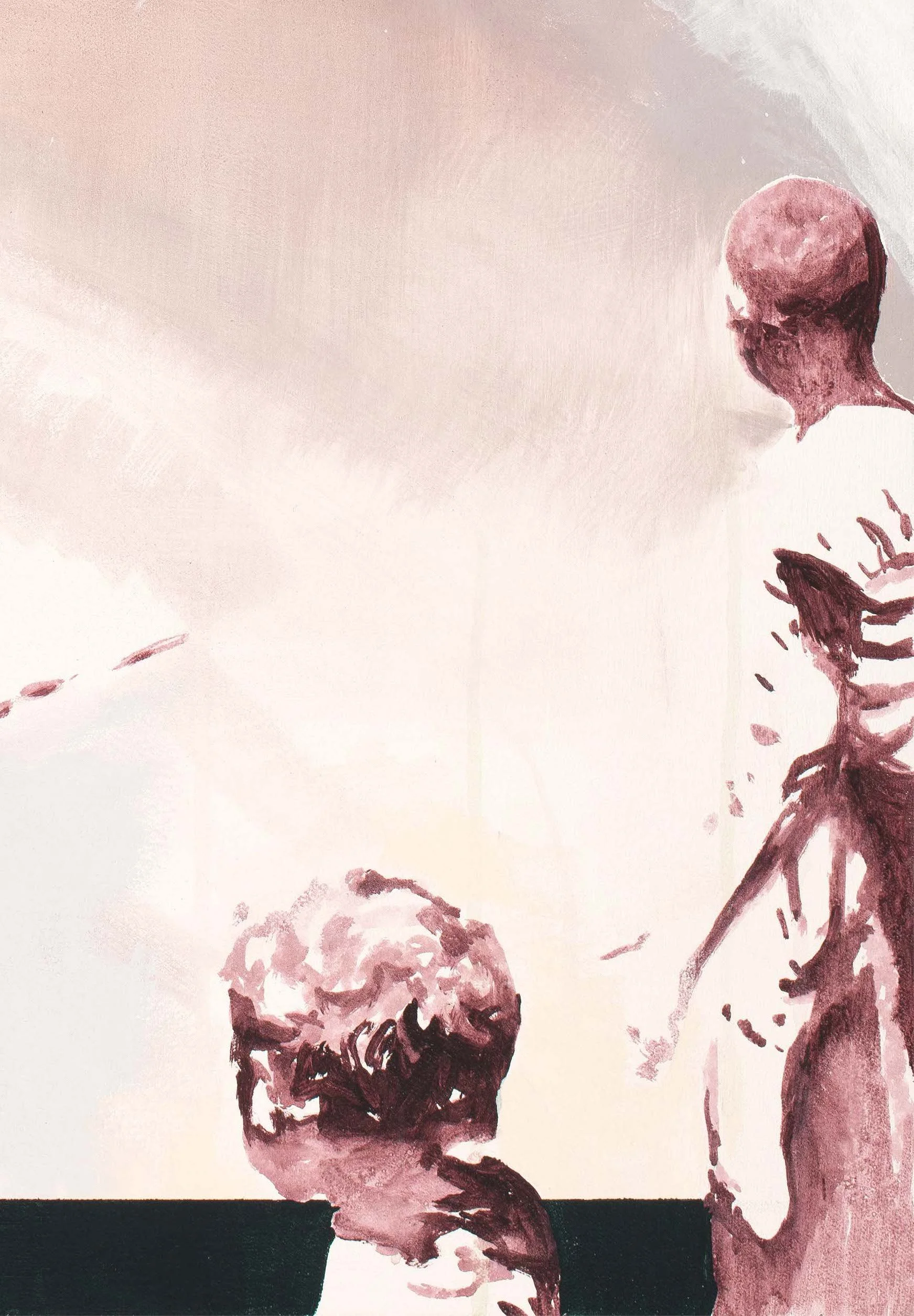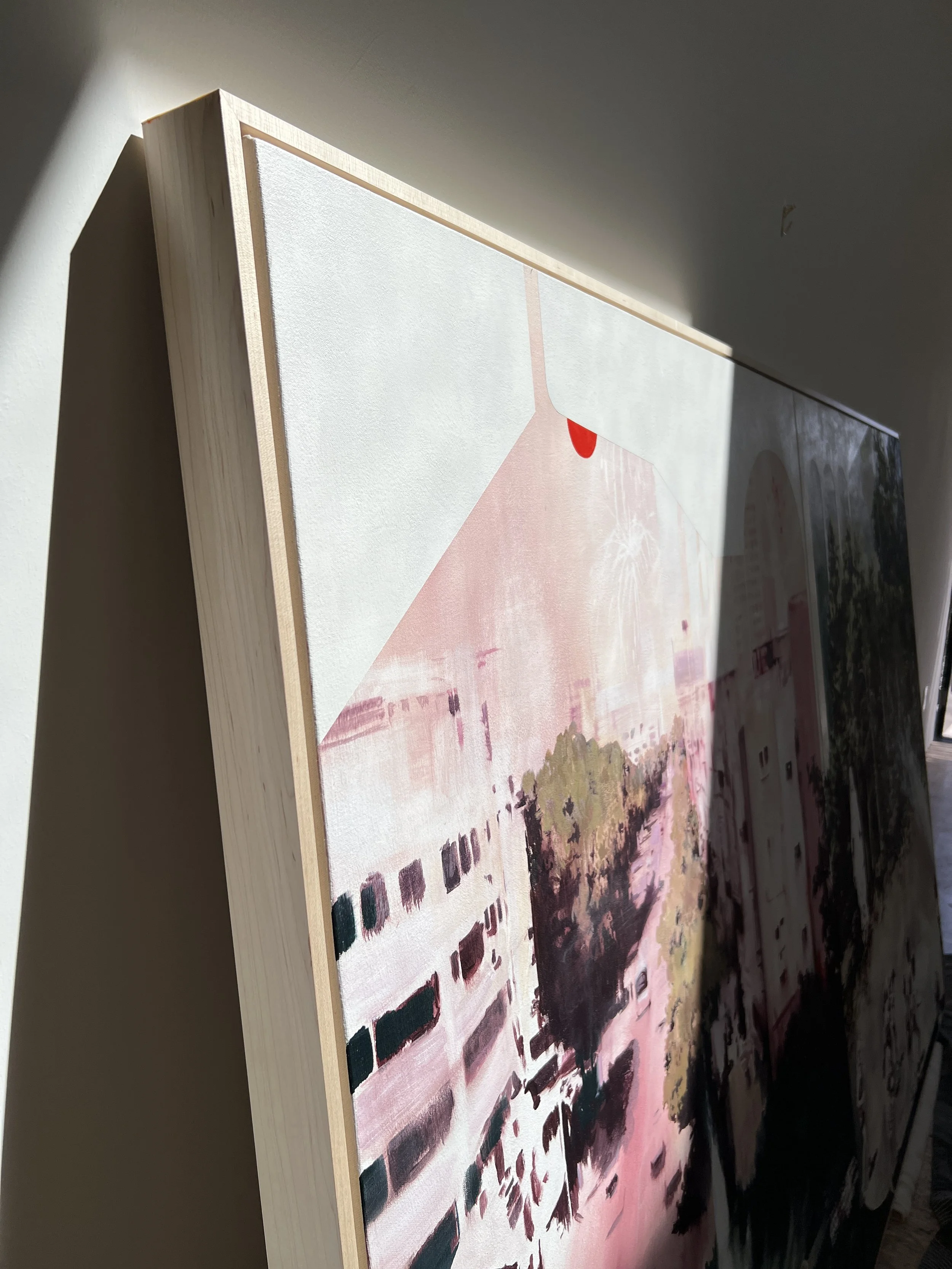 Figures revel in the miracle of water - the best remedy for a hot day. They play in the stream of a busted water main and dance in a celebratory circle under the buoyant splashes of a grand park fountain. A waxen city melts under a heavy sky hung with fireworks and a blazing sun. A ghost-like statue of the Mother Mary holds a vigil near a stand of thirsty trees, representing the gamble our species so often makes by putting our fate in the hands of higher power when s**t really starts to hit the fan. Reddish tones wash throughout the composition as even shadows provide underwhelming respite. The structural elements at the top represent our fervor for containing our worlds indoors, attempting to insulate ourselves from the reality outside. The Dog Days is an illustration of summer in the age of climate change.