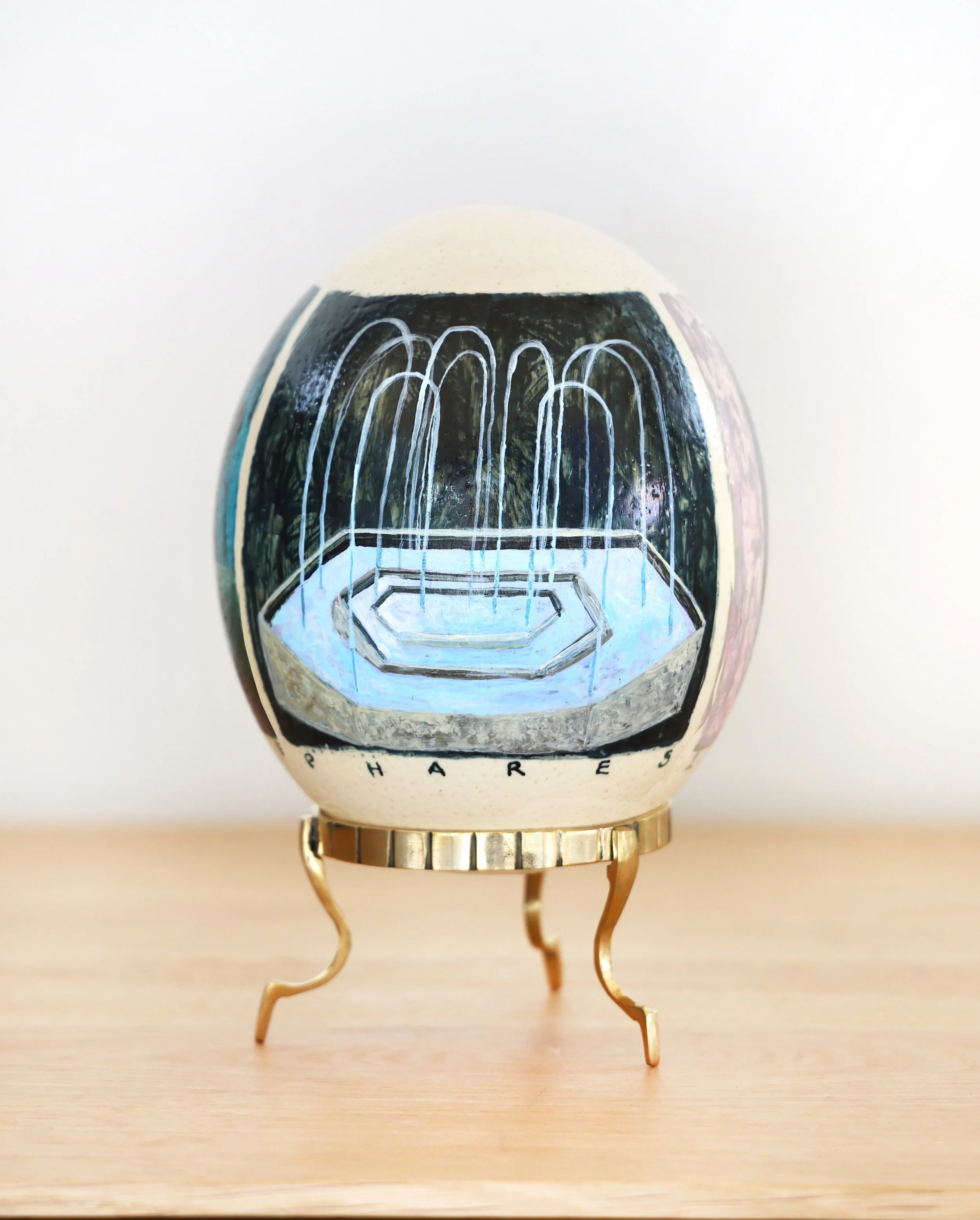 One of my series of painted ostrich eggs. I selected eggs as the vehicle for these paintings as a nod to the Fabergé egg. More famously associated with Russia and the Imperial Easter Eggs, the Fabergé family’s origins are actually French. Unrelated but in addition, it was during the reign of Louis XIV, “The Sun KIng”, that decorated easter eggs emerged. Ostrich eggs from the Court of Versailles’s zoo were elaborately decorated, often with gold leaf, and distributed to the court during the holiday.