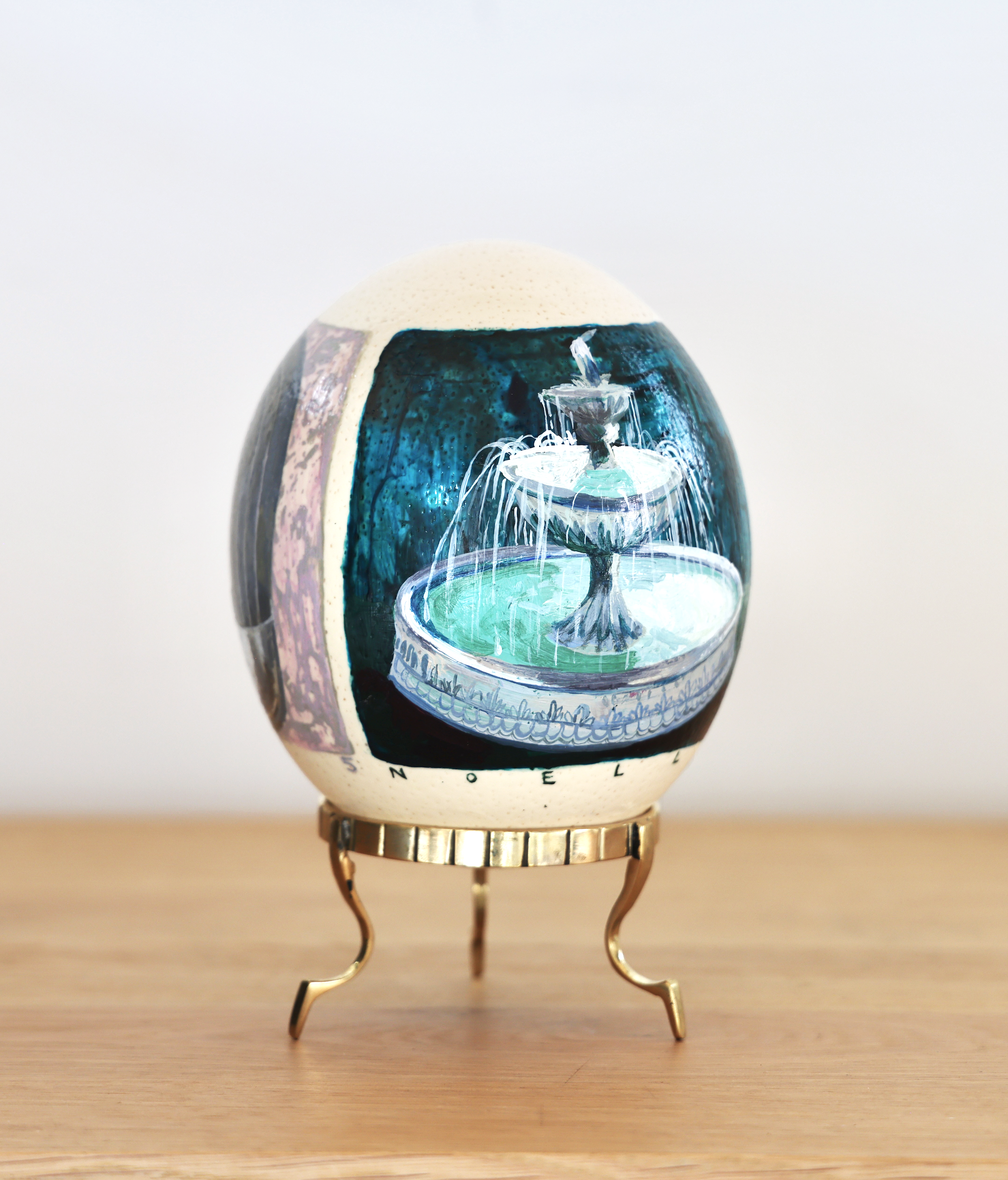 This painted ostrich egg was part of my solo exhibition “Salty and Dark”. It is now available directly from my Denver-area studio. For purchase inquiries please email me at noelle@noellephares.com.