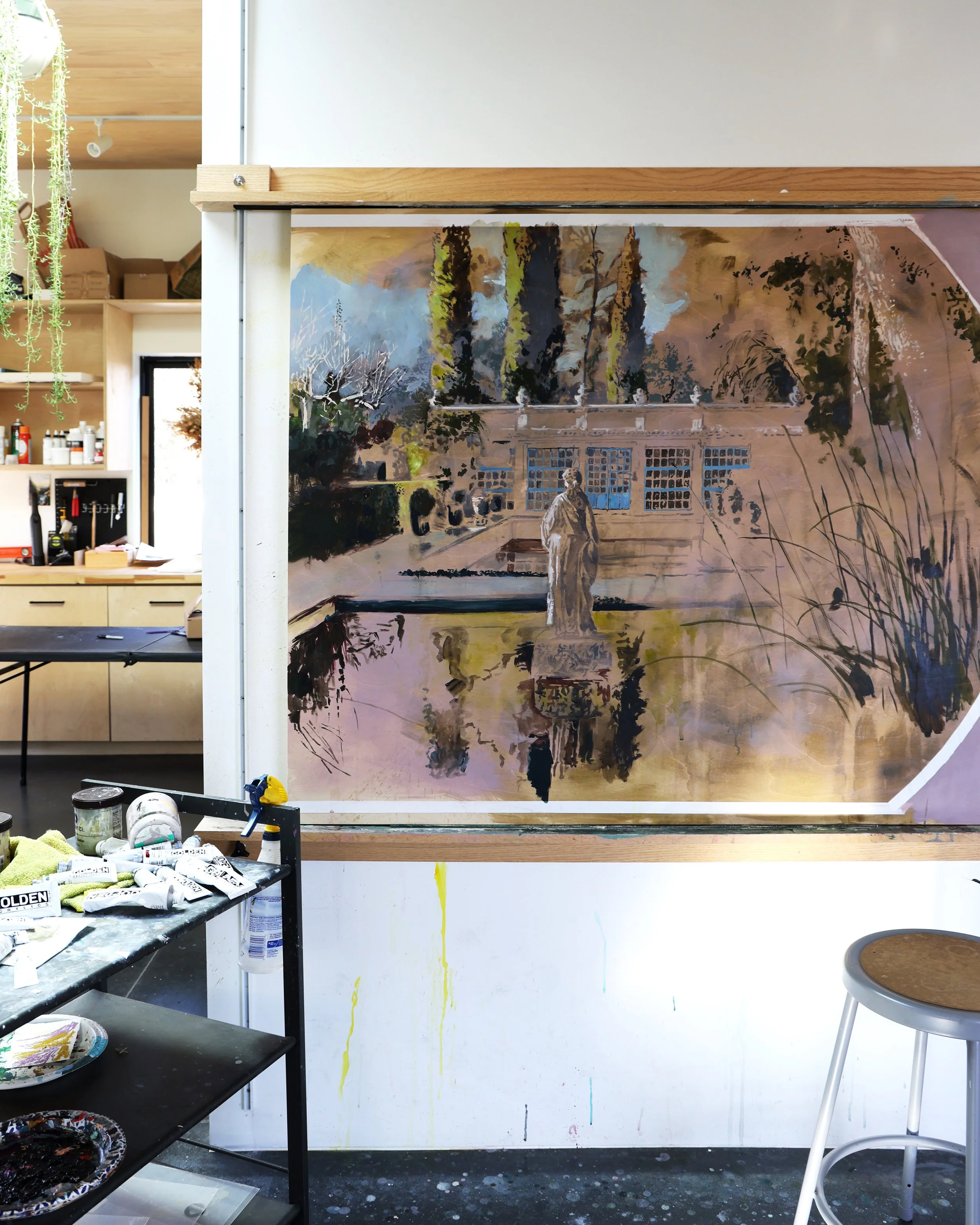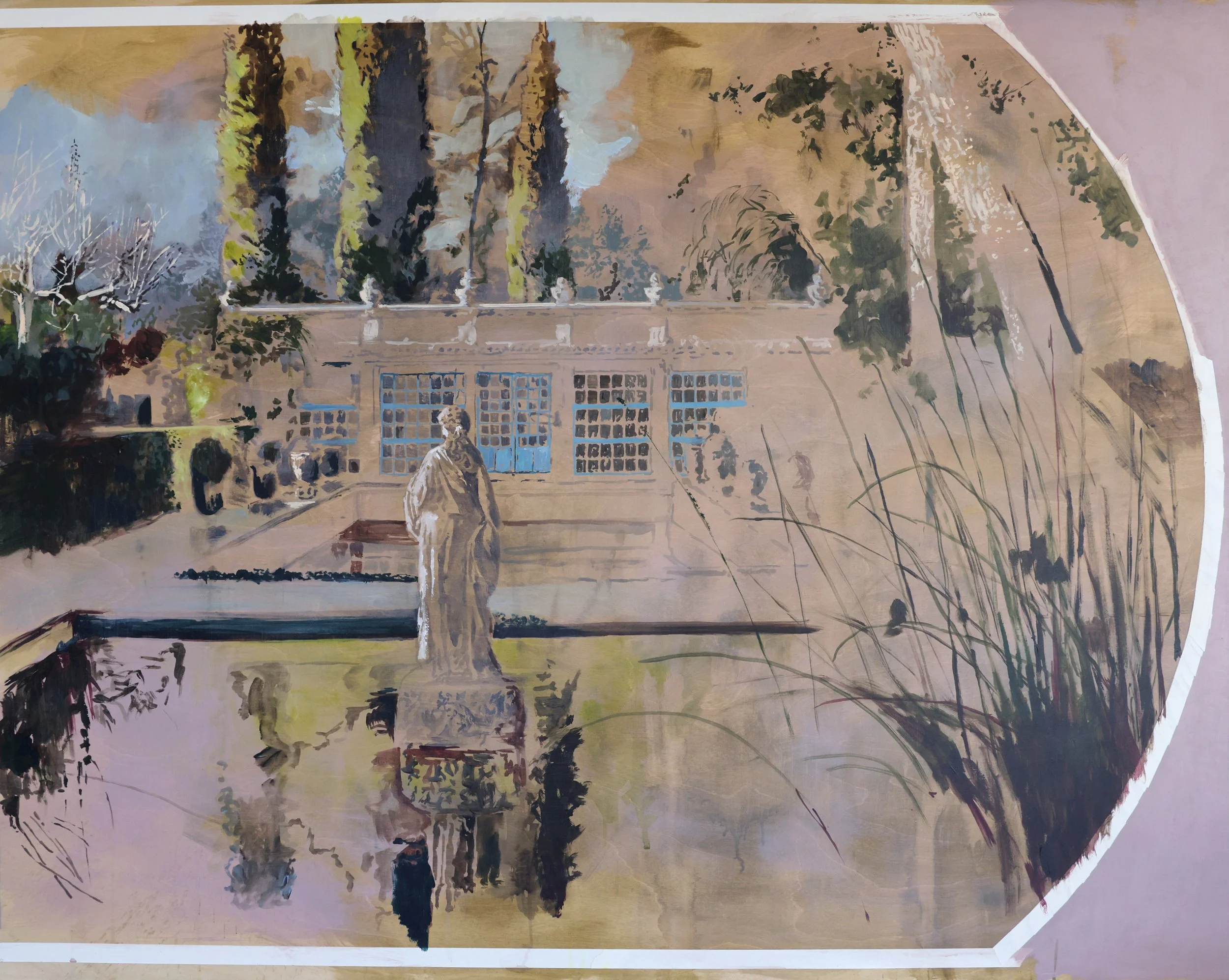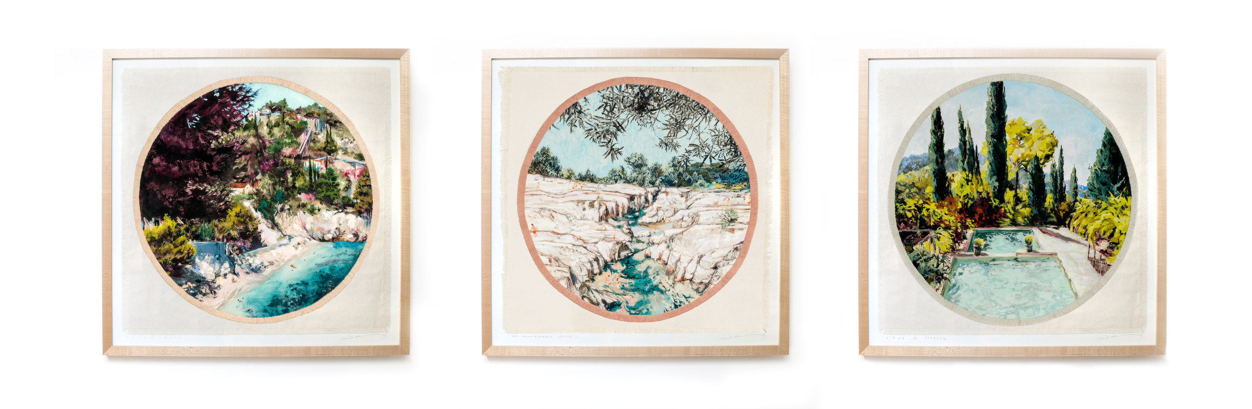 I began all three of these paintings during my residency in Provence and finished them back at my studio in Colorado. Each depicts a location that I visited during that trip, selected for their unique botanics and varied mechanisms (natural and engineered) of retaining water. The circular borders of each painting are embroidered with French thread to add some delicacy to the pieces. The raw St. Mary’s cotton linen artworks are float-mounted to display the fringed edges of the material and framed in maple.