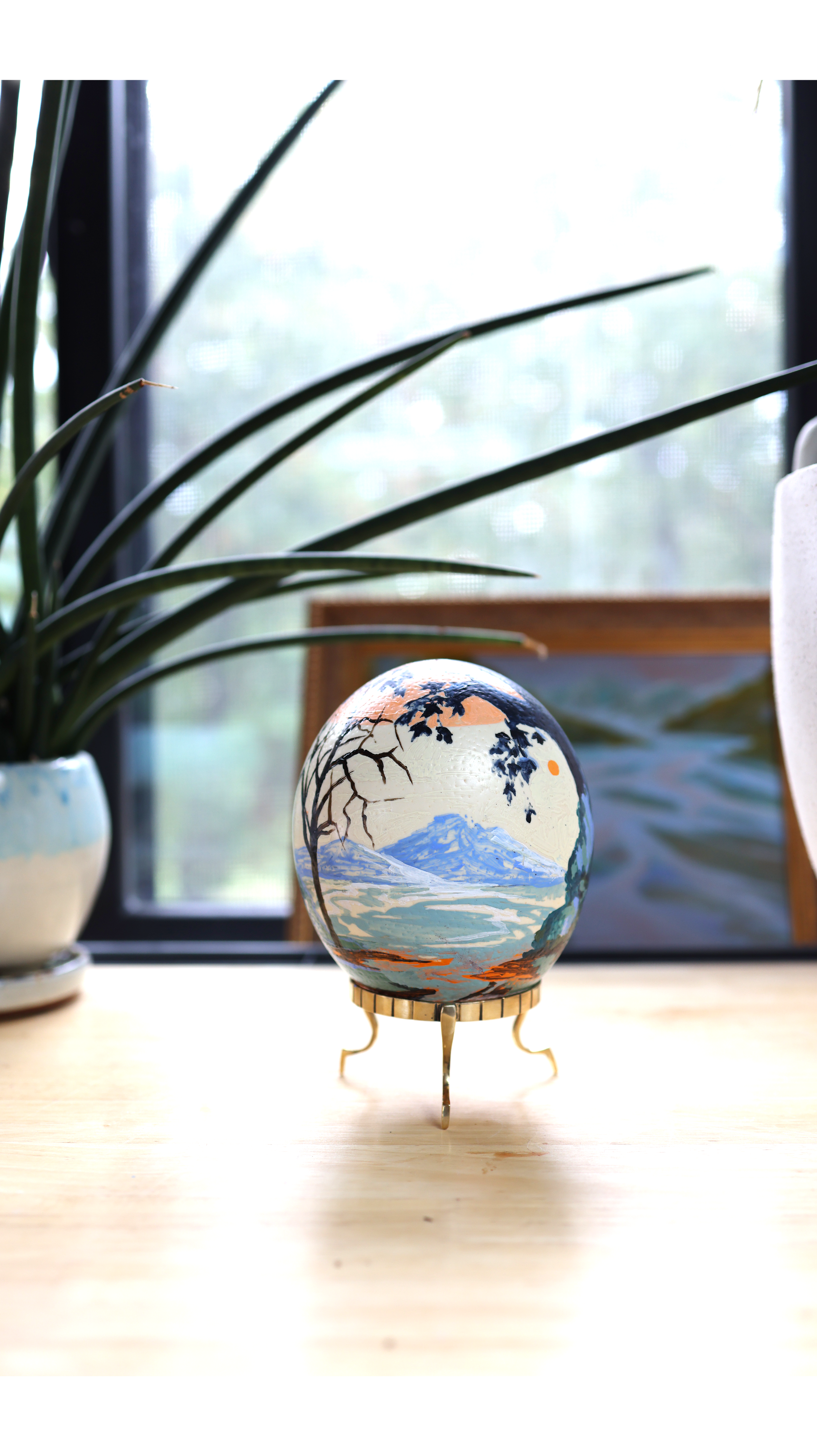 The images below are of the first of the series (not quite finished), included here as proof of concept. Each ostrich egg is approx. 5” in diameter, 6” in height and displayed on vintage brass stands.