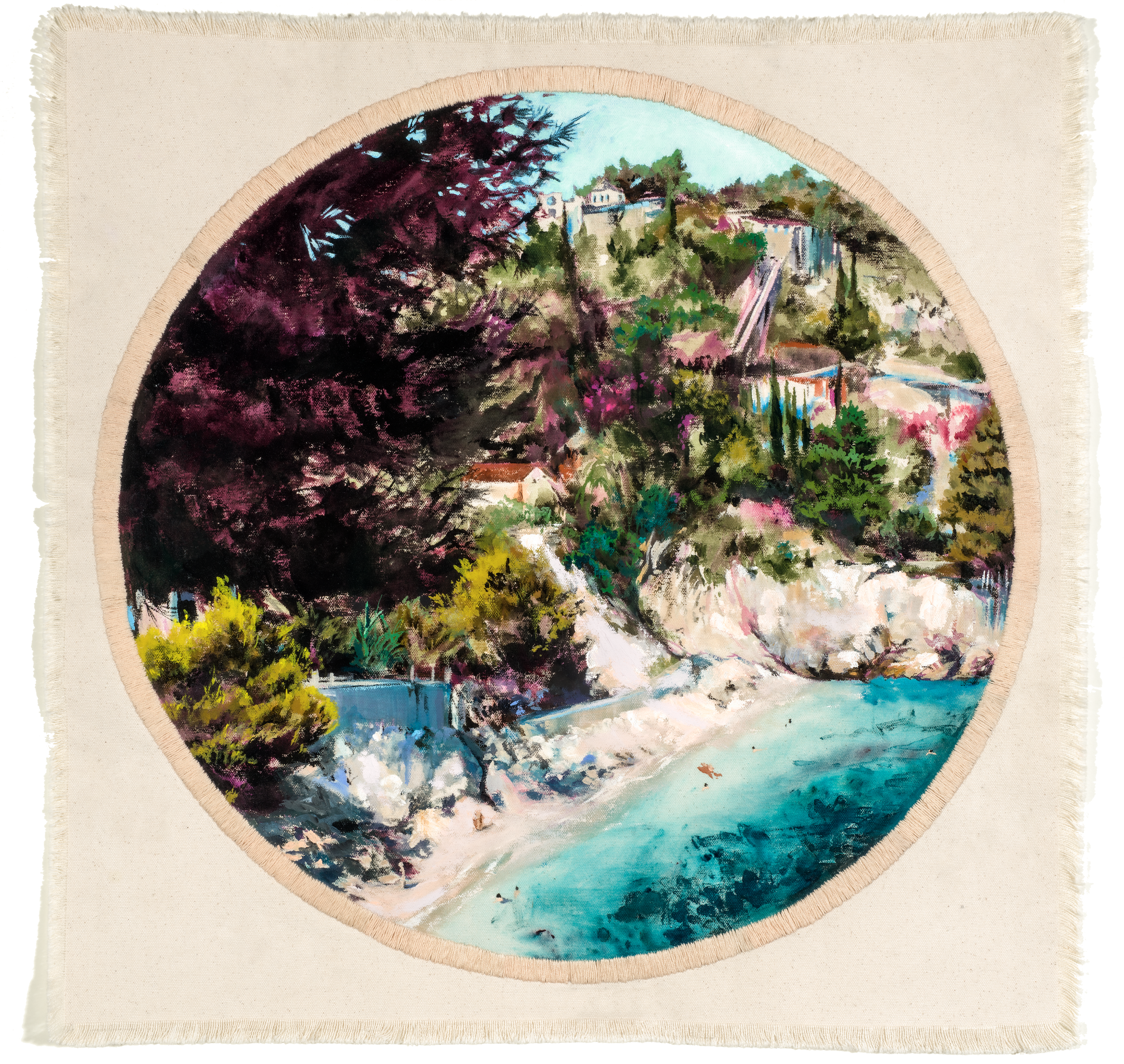 Côte d'Azur, 20x20” | Oil and embroidery on St. Mary’s Cotton