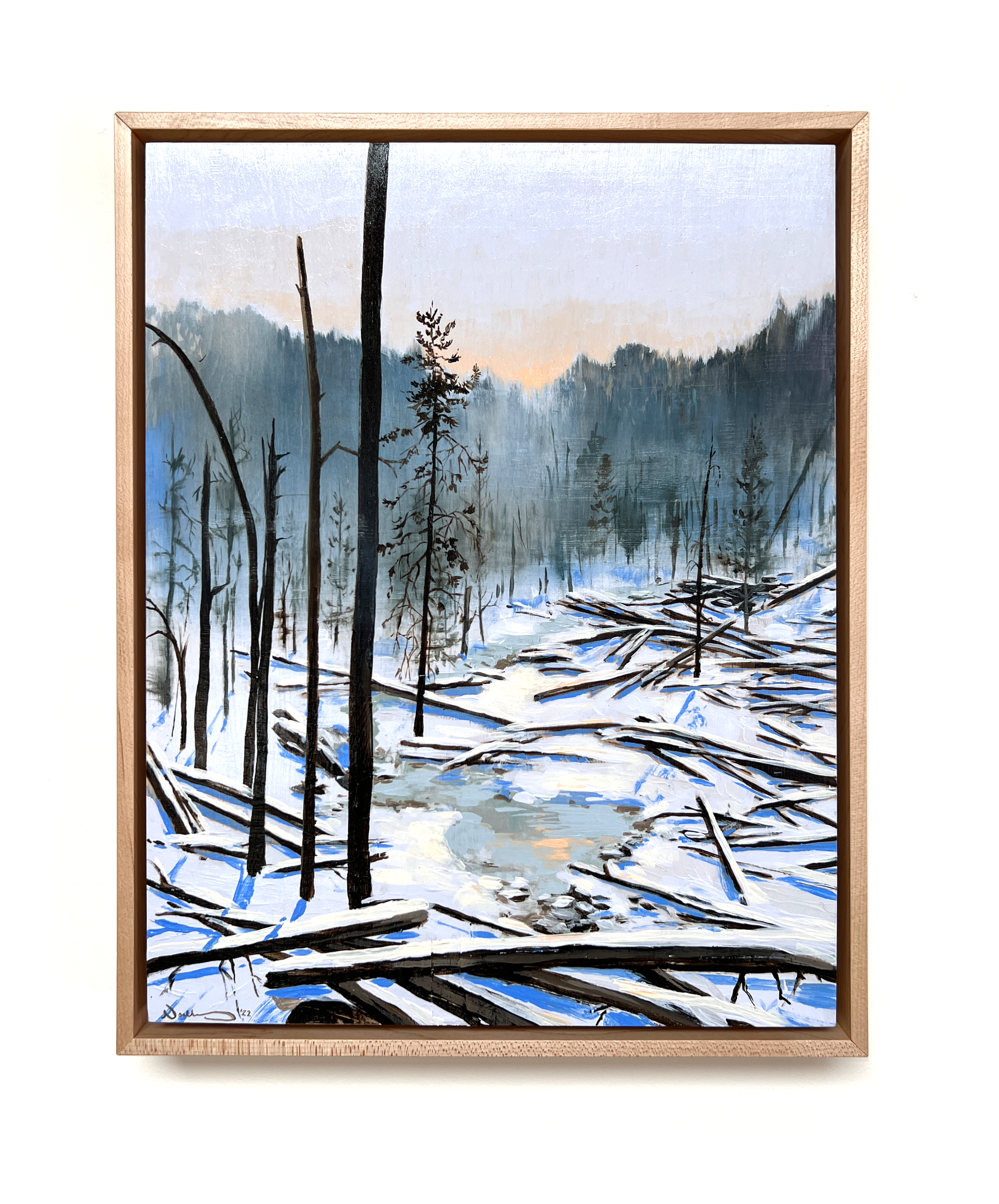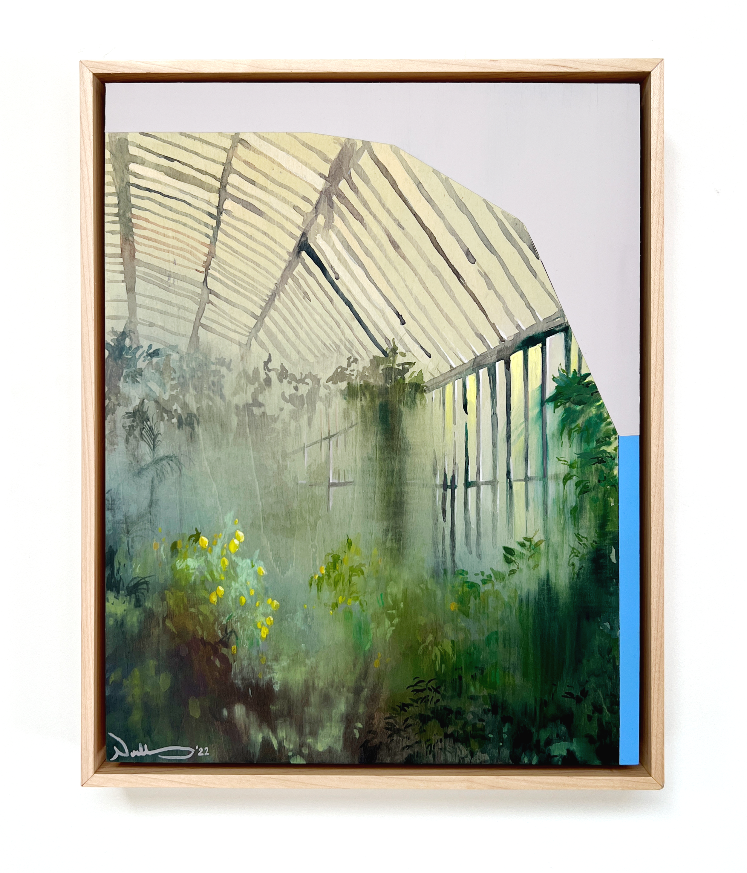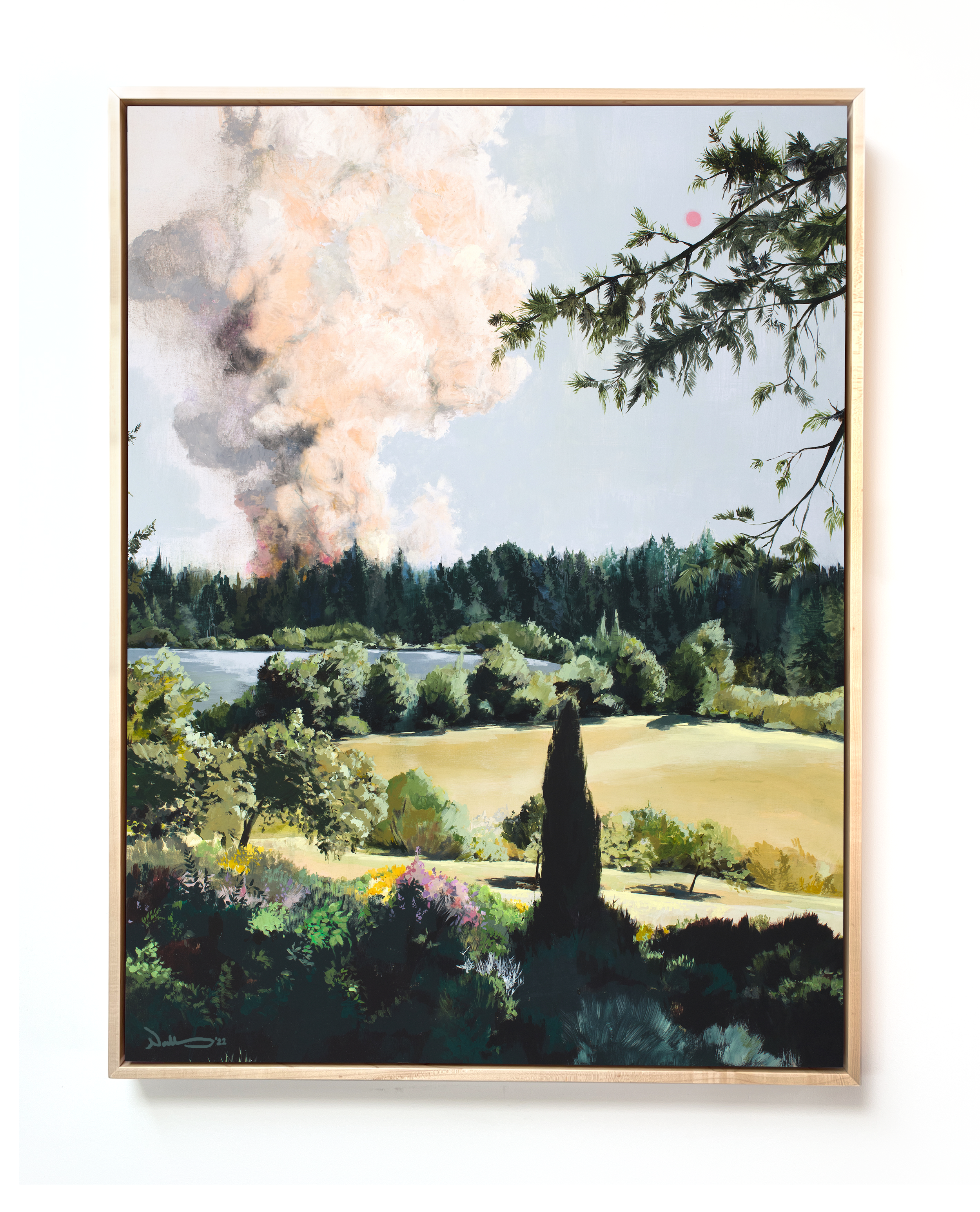 “Hothouse” investigates our complex relationships with heat and its impacts on the natural world as a metaphor for climate change. Painted on panel and canvas, each piece employs landscape and sometimes figures to examine a different facet of this topic. Like the greenhouse, short-term beauty and utility often accompany introduced heat. But there are warnings to be heeded, activists to be raised, revolutions to be born. Rooted in mostly real places, this work was created as a meager attempt to spark whatever can be sparked in the hearts of viewers who love life on Earth and care to see it go on.”