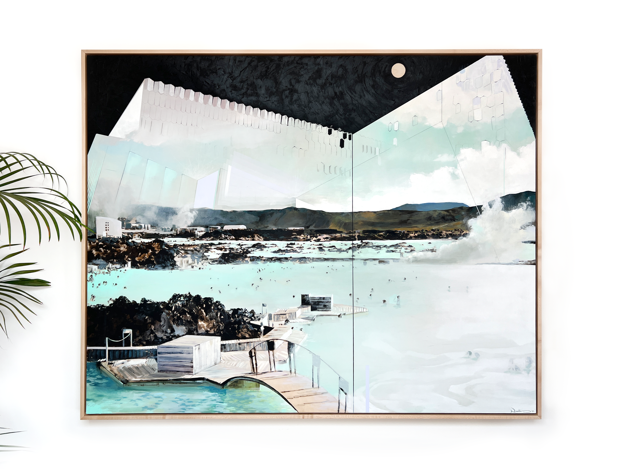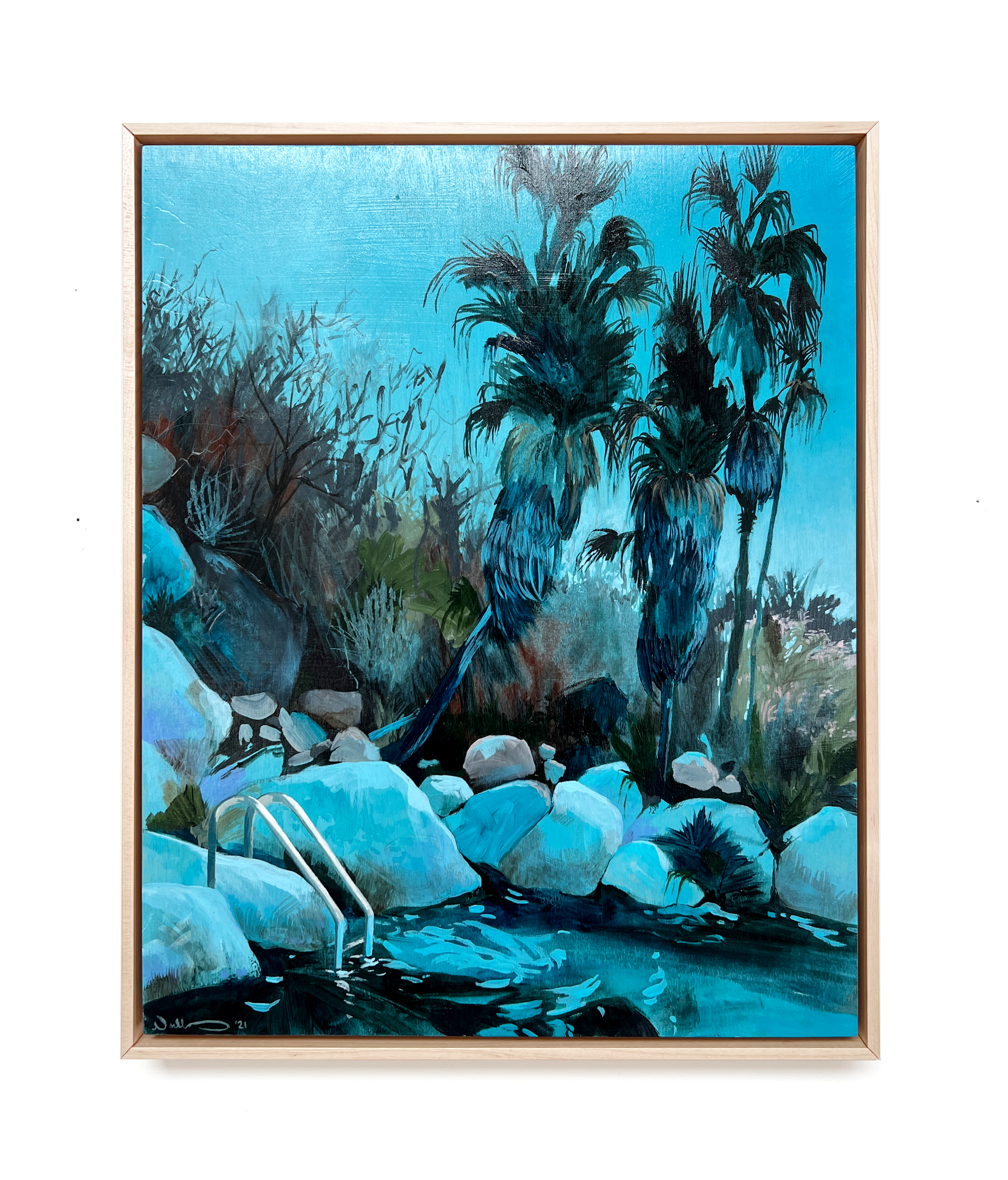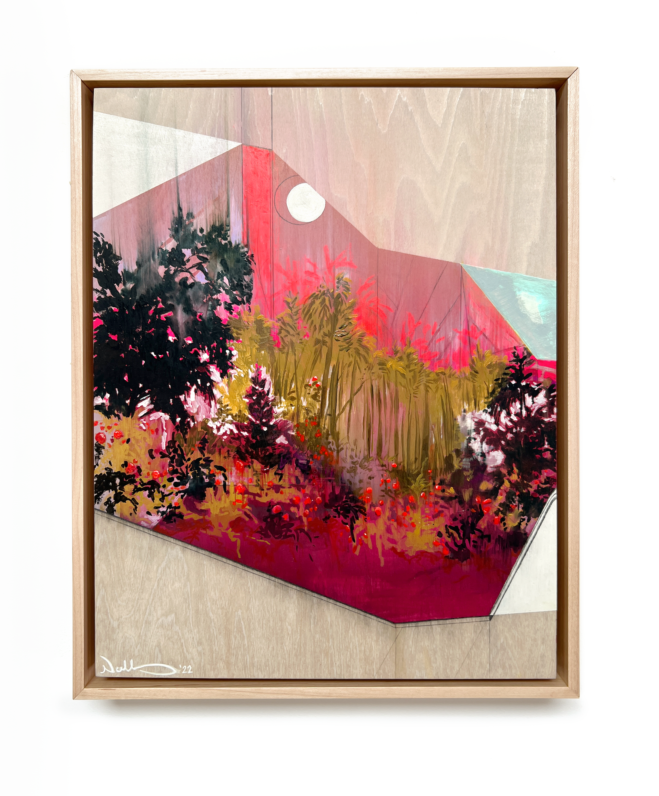 “I titled this body of work “Hothouse” before I even began painting it. My husband and I were staying at a ranch in Wyoming in the dead of winter and explored the property one dusky eve. While careening across the sultry tones of the snow-covered plains, a neon glow suddenly erupted in the distance, bathing the gentle curves of the surrounding topography in a shock of electric pink. It came from a greenhouse.