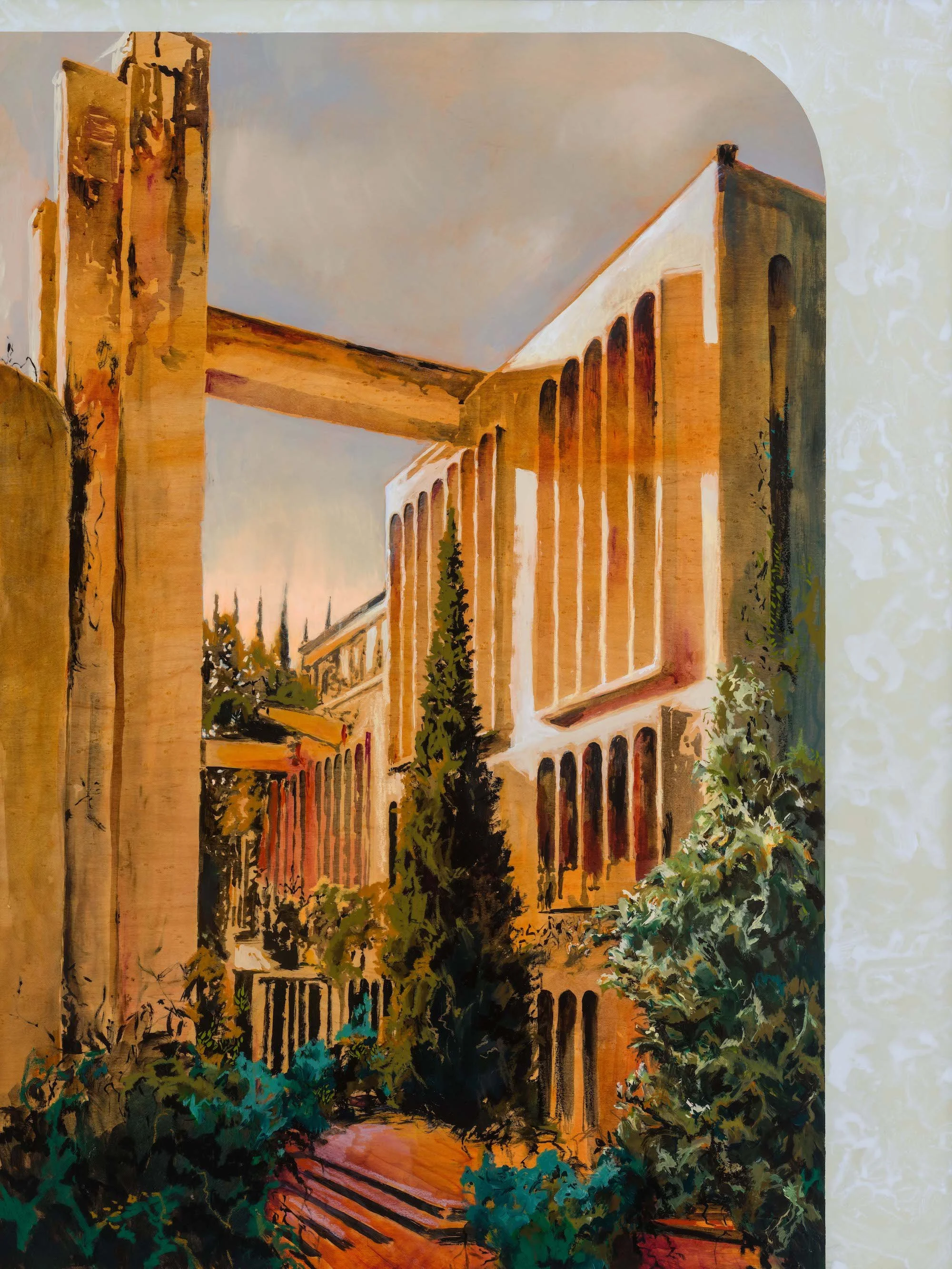 - a quote by the author of a biography about Ricardo Bofill, the esteemed Spanish architect whose work I was studying in this painting. Bofill had a knack for breathing new life into aged, industrial megaliths. The painting depicts “La Fabrica”, an old cement factory factory on the outskirts of Barcelona that he transformed into an astounding structure which served as his home and workplace. I particularly love how Bofill used gardens to add living texture and color into otherwise austere settings.