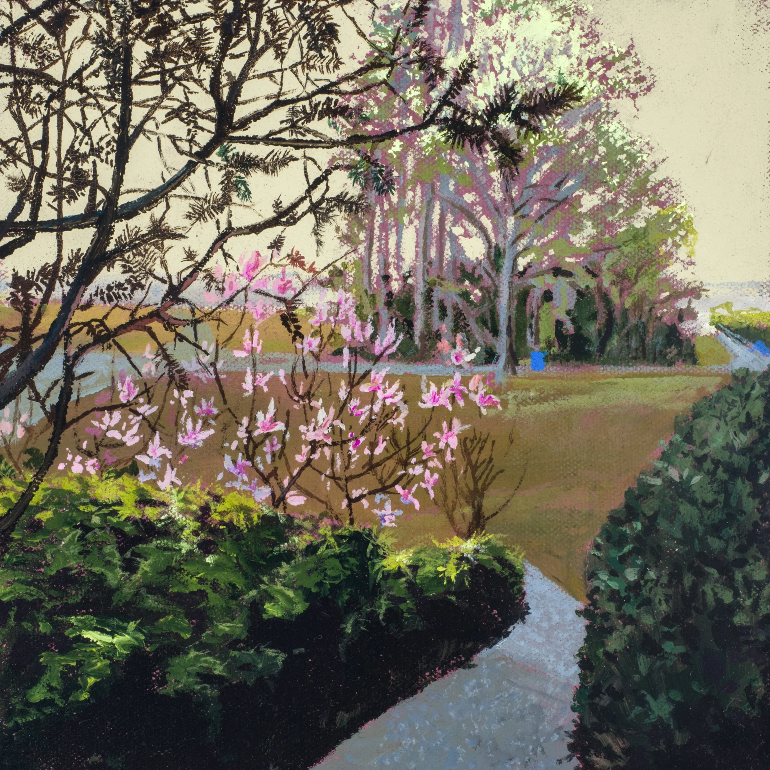 A view of my garden in coastal Washington. This piece was part of my collection “Cardinal Spring” for Nahcotta gallery in 2023.