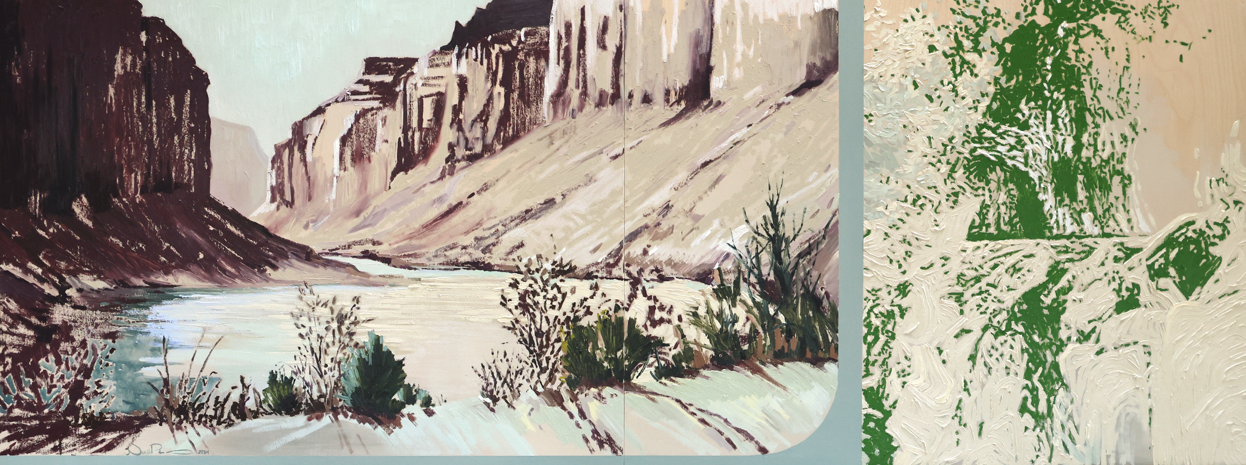 A depiction of the Marble Canyon section of the Grand Canyon, and a waterfall further down the canyon in a grotto called Elves Chasm.
