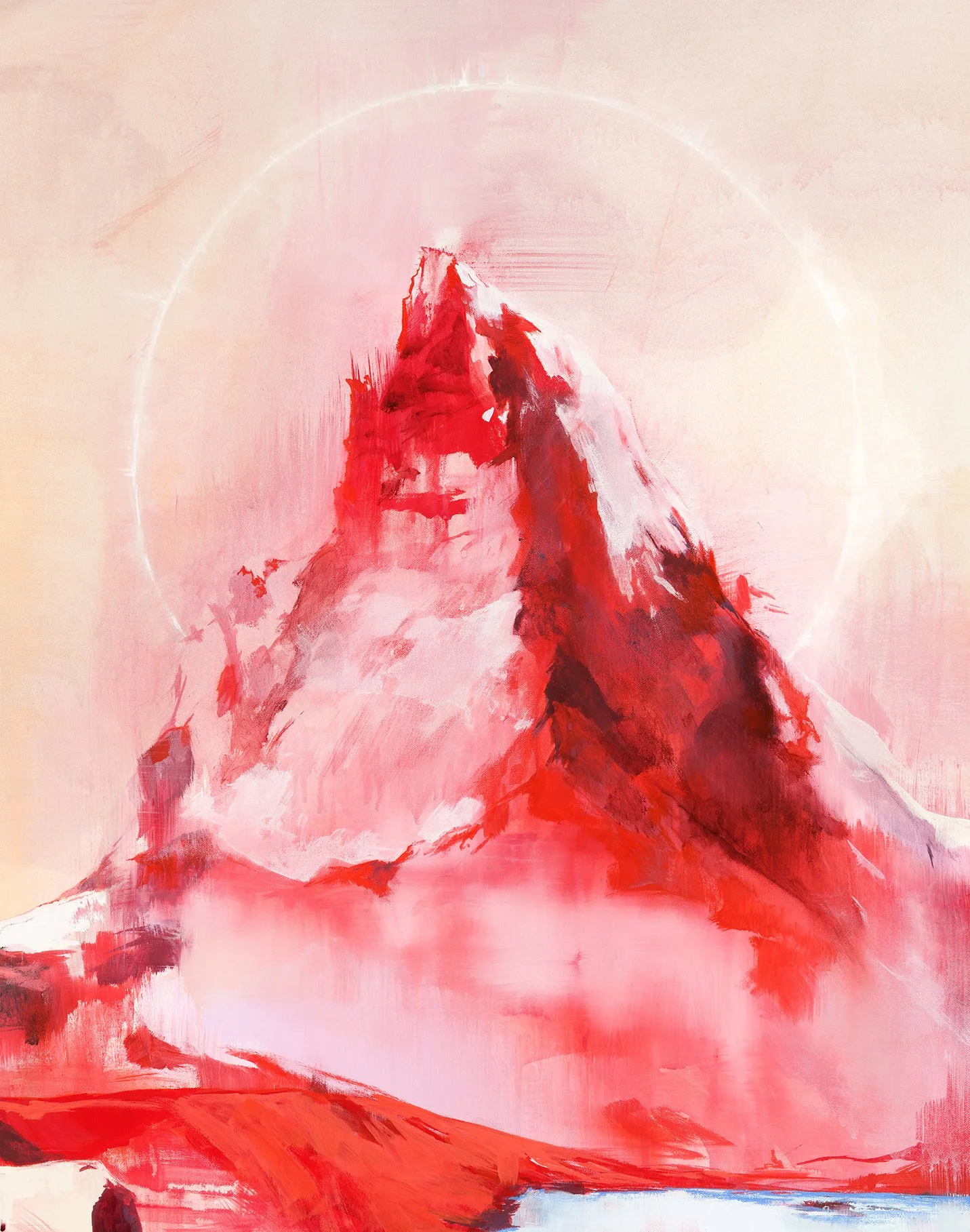 As a child, Disneyland’s ride the Matterhorn held an enchanting spell over my sister and I. The mystery of the Abominable Snowman lurking in the roller coaster’s corner, the way the mountain itself provided the three-dimensional backdrop for this thrilling ride (constructed at 1/100 the size of the real thing). The peak became evermore iconic to me as a natural feature both revered for its beauty, and also feared for its formidable scale and dominance over the surrounding landscape as I later learned that Disney’s attraction was inspired by the real thing in Switzerland. This painting attempts to convey both the reverence and the intimidation that the real place can make the viewer feel, the sense of near-holiness the mountain seems to emanate with. The figures at the bottom are small, serving only to reinforce the scale of the mountain and remind the viewer how small and fleeting our presence amidst giants like The Matterhorn really is.
