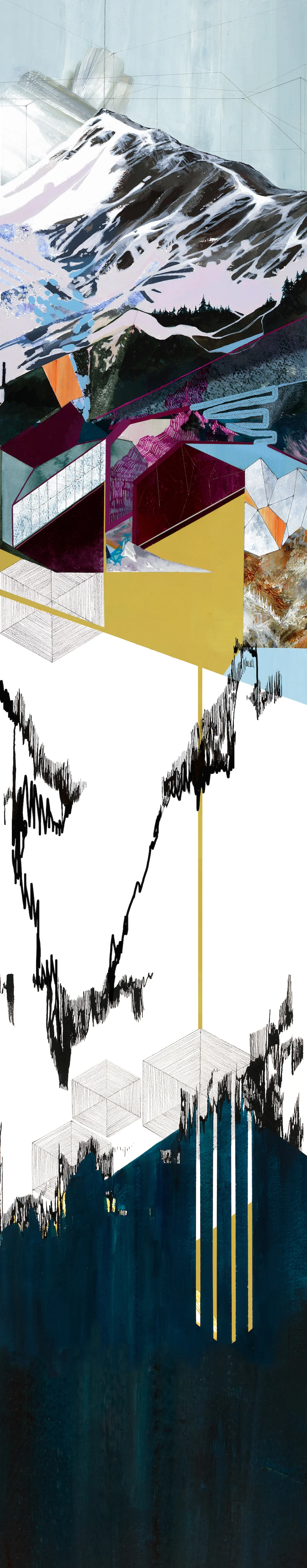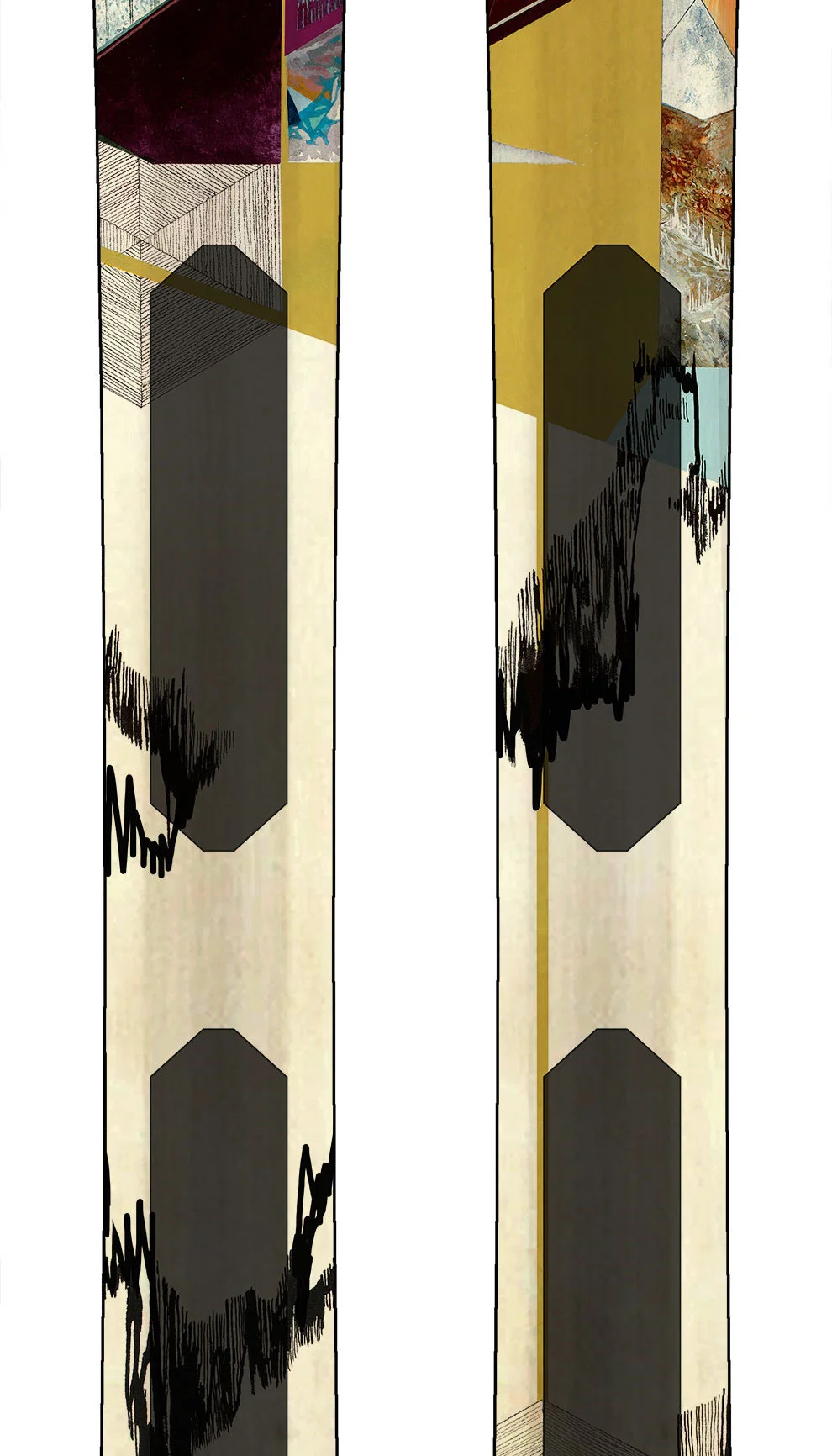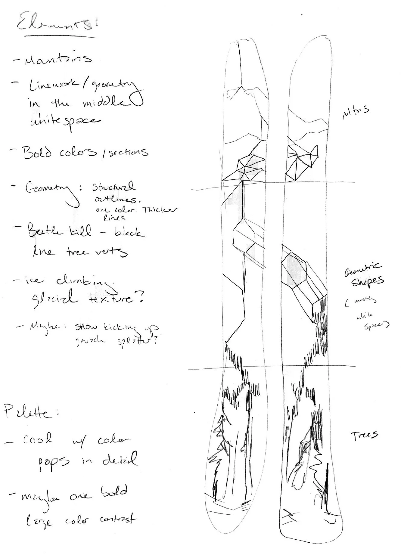 After visiting Meier’s shop and talking specs with both teams, I embarked upon my mission to create the paintings that would become the topsheet design for both models we decided on for the final product. Unlike most ski or snowboard graphics, I wanted to create physical paintings that would later be translated into a digital format via high-res photography. Typically the graphics are produced digitally through and through, but I wanted to maintain the organic brush strokes and imperfect, handmade fine line work into these works that are hallmarks of my style.