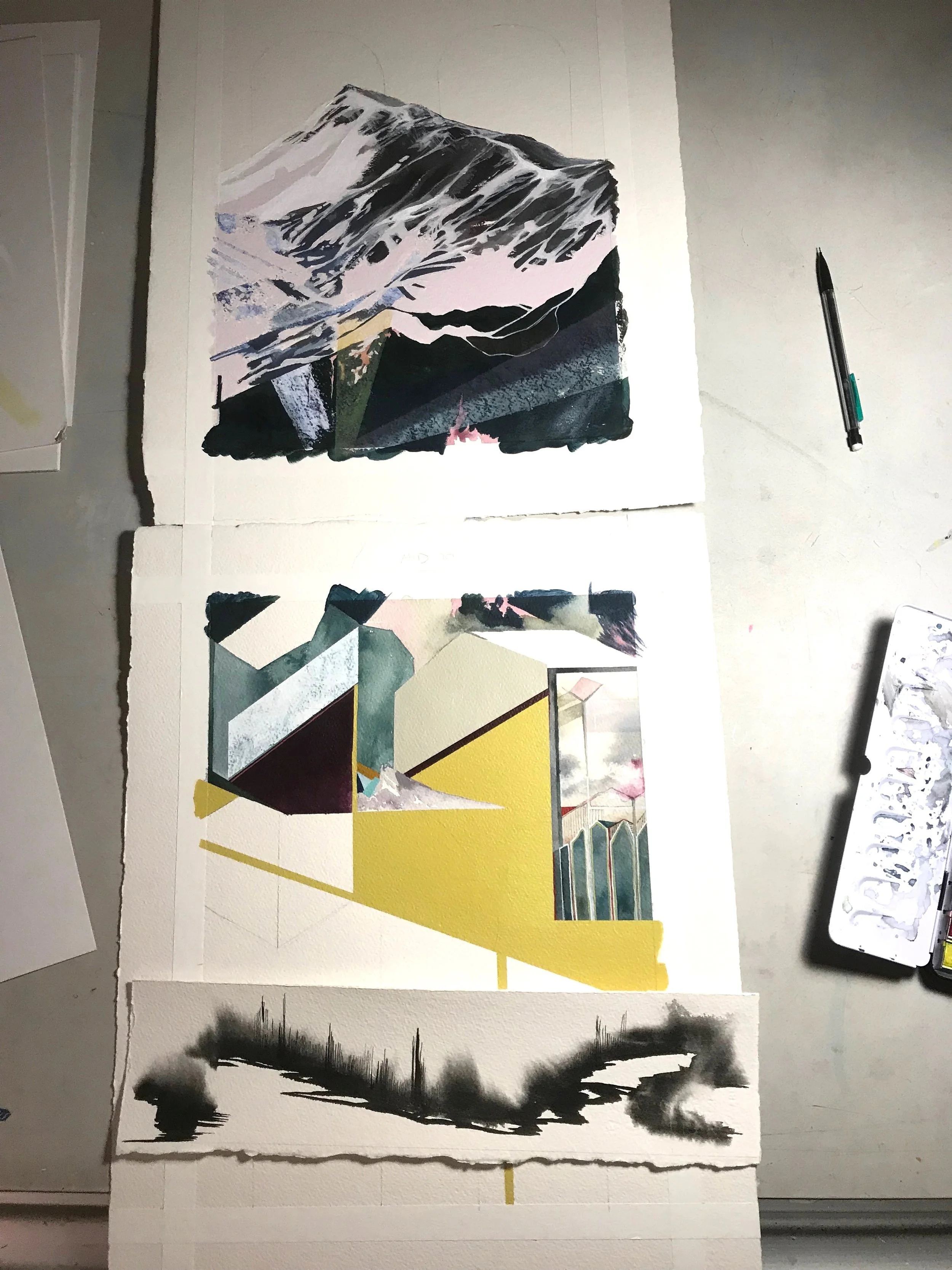 Three 12 x 18” works on Arches 300lb cold-pressed watercolor paper, created with a combination of watercolor, acrylic, gouache, sumi Inks, and pencil..
