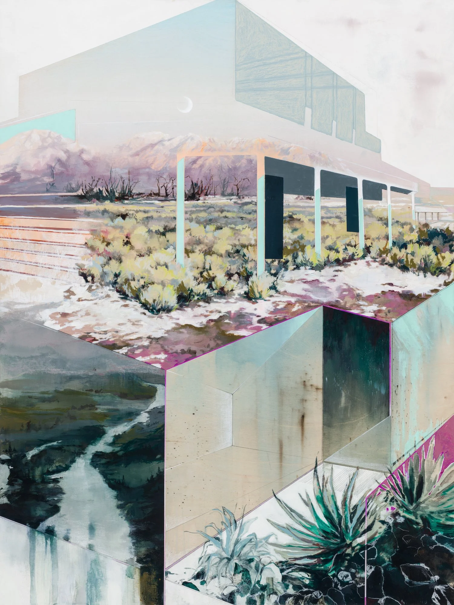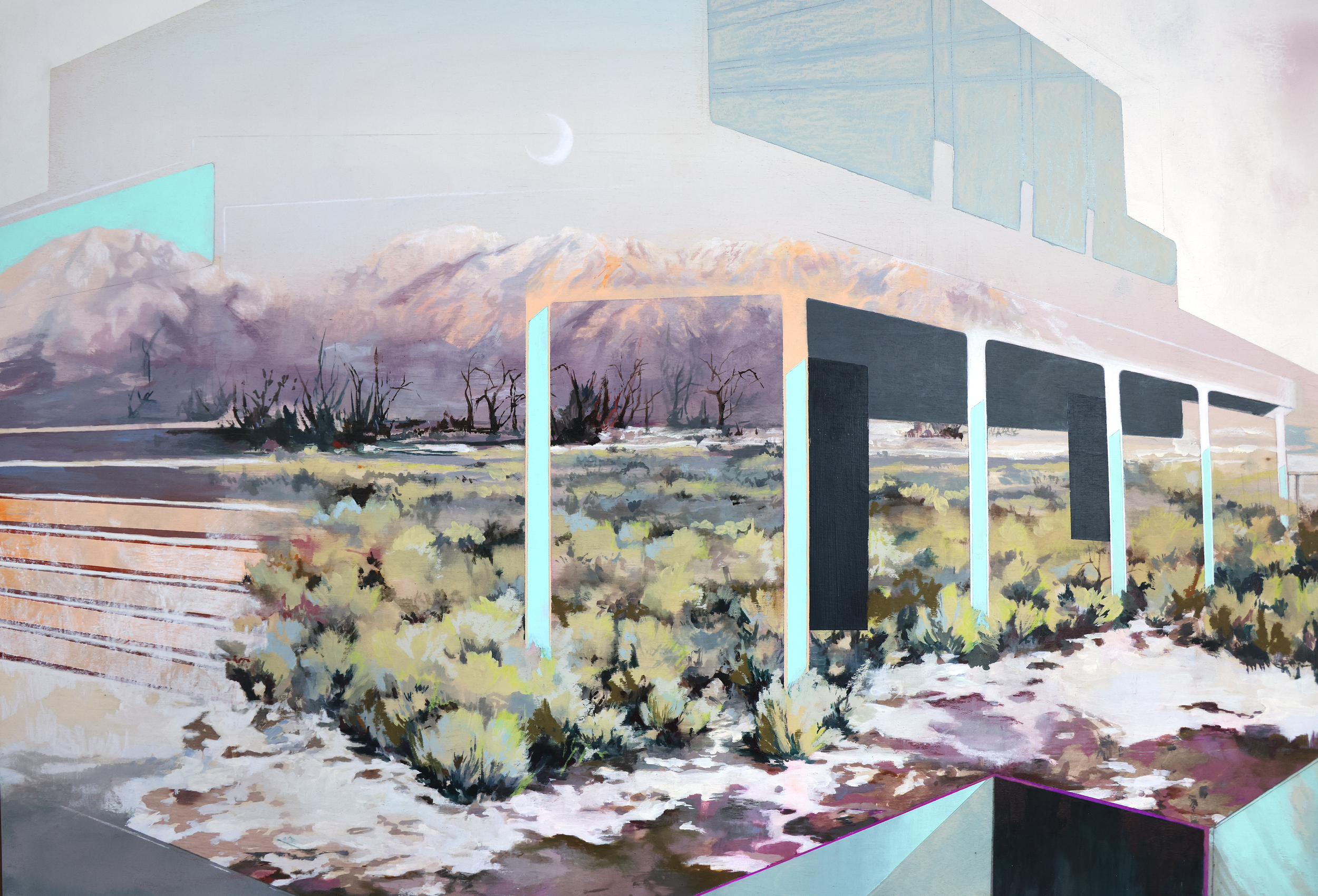 I painted this piece on commission for the Mellow Moon - a hip, vintage motel in Del Norte, CO that was recently revamped by Lauren Richardson of @thesursy to evoke “roadside Americana” vibes that jive with the rustic charm of the small southern Colorado valley town. The area reminds me a lot of New Mexico. She wanted a painting that would hang in the lounge/cocktail bar portion of the property that considered the local landscape and architecture. I relied heavily on the lines of the building itself, some reference photos I took while on a quick scouting trip in January of the valley, the portion of the Rio Grande river that runs through the town, the nearby Sangre De Christo mountains at sunset, and some imagery of the area of local vegetation and scenery during other seasons to come up with a composition and palette that attempted to convey a sense of the area as a whole.
