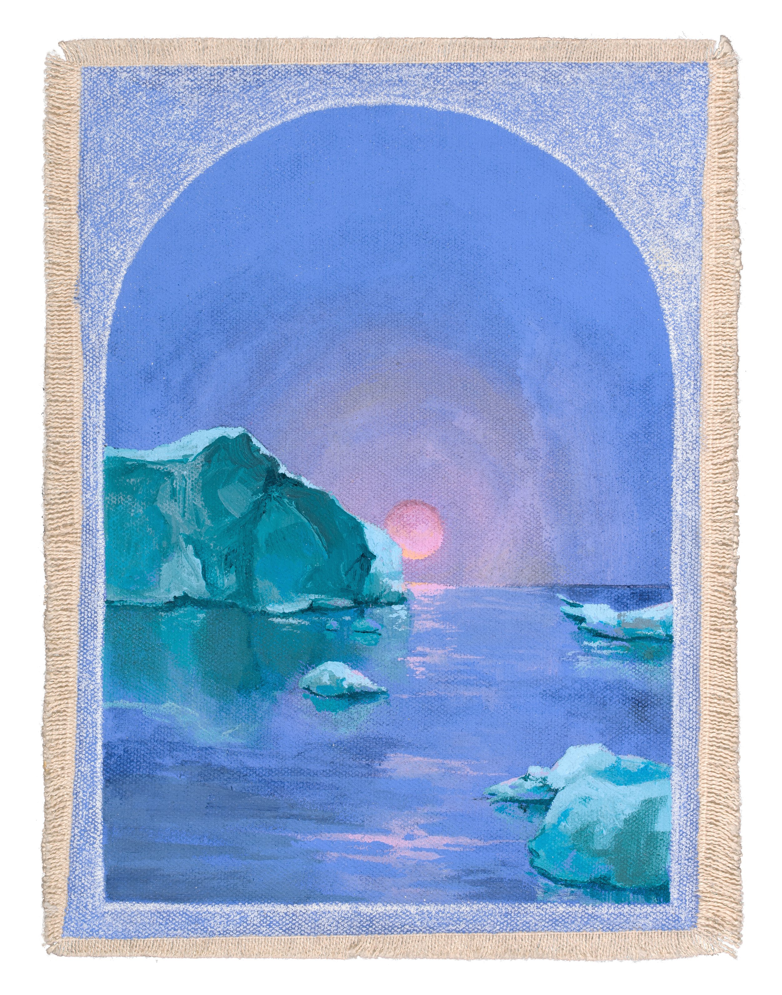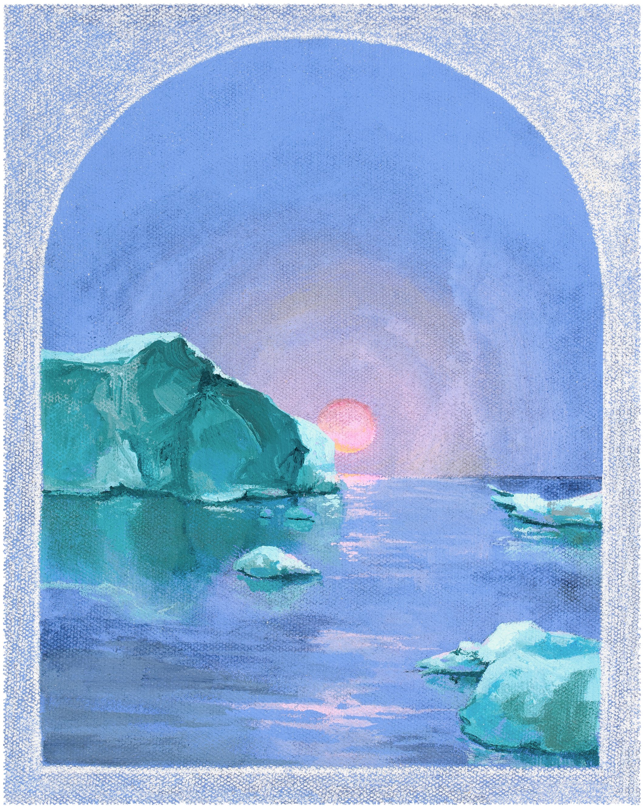 I wanted to depict the preciousness of shrinking glacial landscapes in this piece. It feels warm and cozy, despite being a cold place, which contributes to its precious nature - frozen landscapes don’t stick around for long in a warming world. Despite that hard truth, there is fleeting comfort in seeing this arctic landscape captured in perpetuity in this little snow globe.