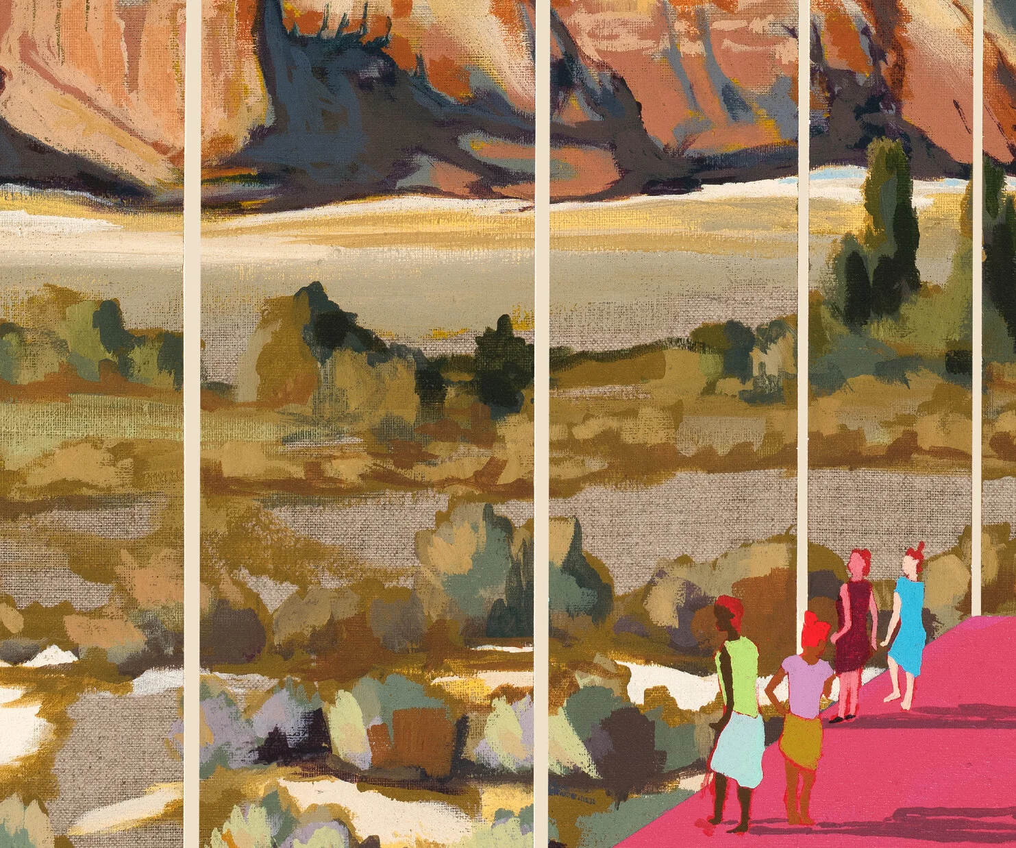 Observatory II is part of a two-painting series about how humans experience nature in the modern world. In this piece, a sweeping desert landscape is observed from inside of a large, abstract building with sweeping panoramic windows. The onlookers gaze out at a landscape inspired by Arizona’s Vermillion Cliffs.