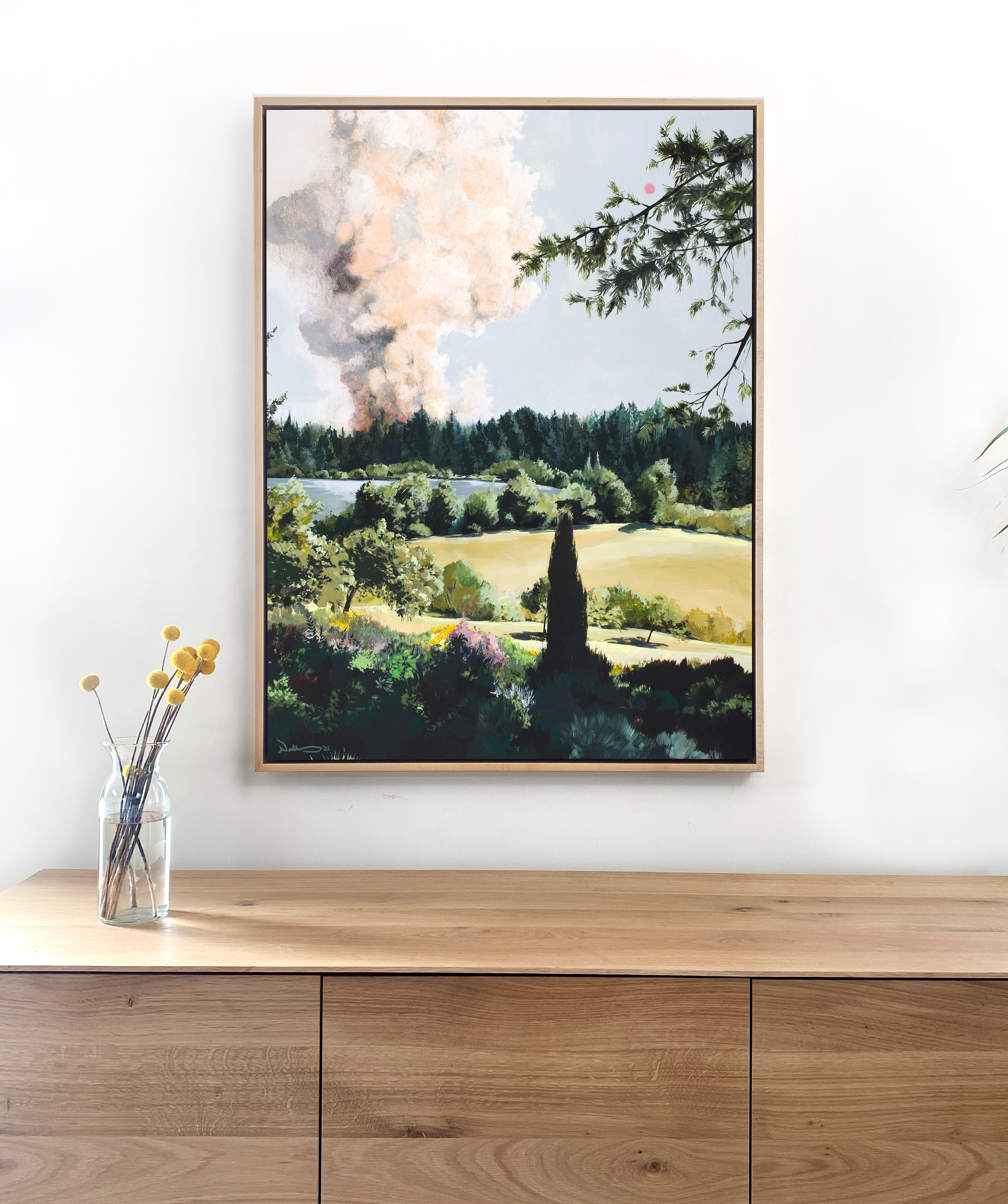 A pristinely manicured park stands boldly in the foreground of “Plume” while the smoke of a newly sparked wildfire leers menacingly in the distance. Much like a dying person sees her life flash before her eyes in the moments before death, I have always found the presence of a wildfire plume to be a powerful apparatus in the exercise of appreciating what lies before you - the sudden threat of its existence making the precious beauty evermore acute. What was assumed is at once a miracle as its very being is no longer guaranteed. I remember having that thought as I watched the massive plume above my hometown lurch across the sky during the 2018 Camp Fire. Memories that had been frozen for decades in childhood nostalgia suddenly thawed that day, rushing brightly into my mind’s eye only to be left there to cure as impressions forever as the physical basis for them burned away.