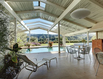 The actual building referenced for this structural painting was designed by architect Cliff May, and lives on in the Santa Ynez Valley outside of Santa Barbara.
