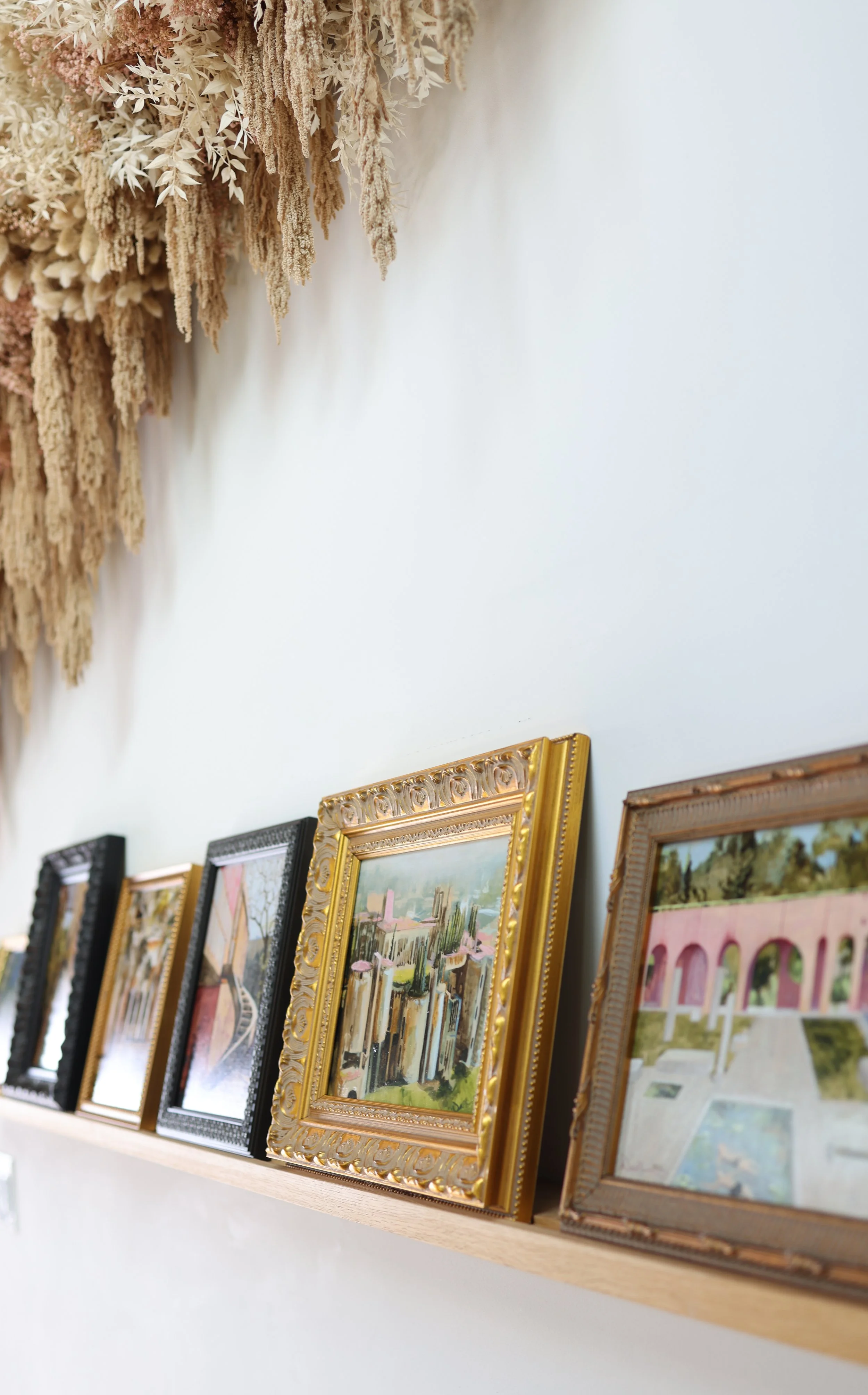 The paintings themselves offer depictions of signs of human life. Wherever humans are, built elements exist. The best of design draws on the form of the landscape around it to enhance the structure’s presence and function, thus the scenes in each attempt to do the same. There is also a sense of play in these artworks as I largely allowed the composition to unfold during the painting itself instead of relying on a well-formed plan made before setting my sights on the panel (my typical practice). They are all quite small, which was purposeful in that I have an easier time being exploratory on small surfaces than on large ones. 7 of the 9 paintings are finished in ornate, vintage-like frames that provide a stark contrast to the contemporary landscapes that play out on the panels themselves. Each is a world within itself, not much informed by the painting that came before or after it. They are, perhaps, an exercise in raw creativity - a process that I very much needed at this time in my life.”