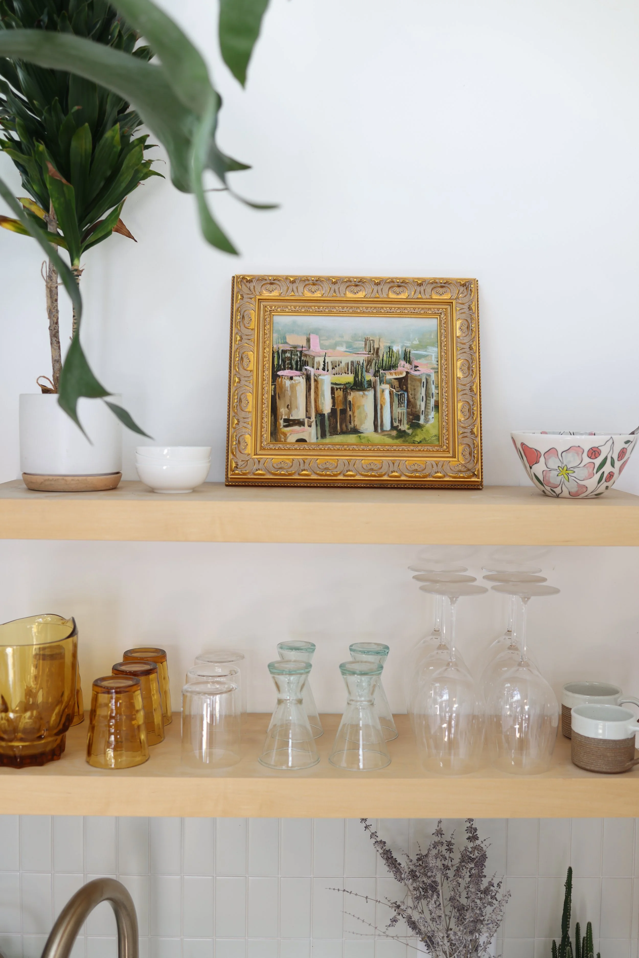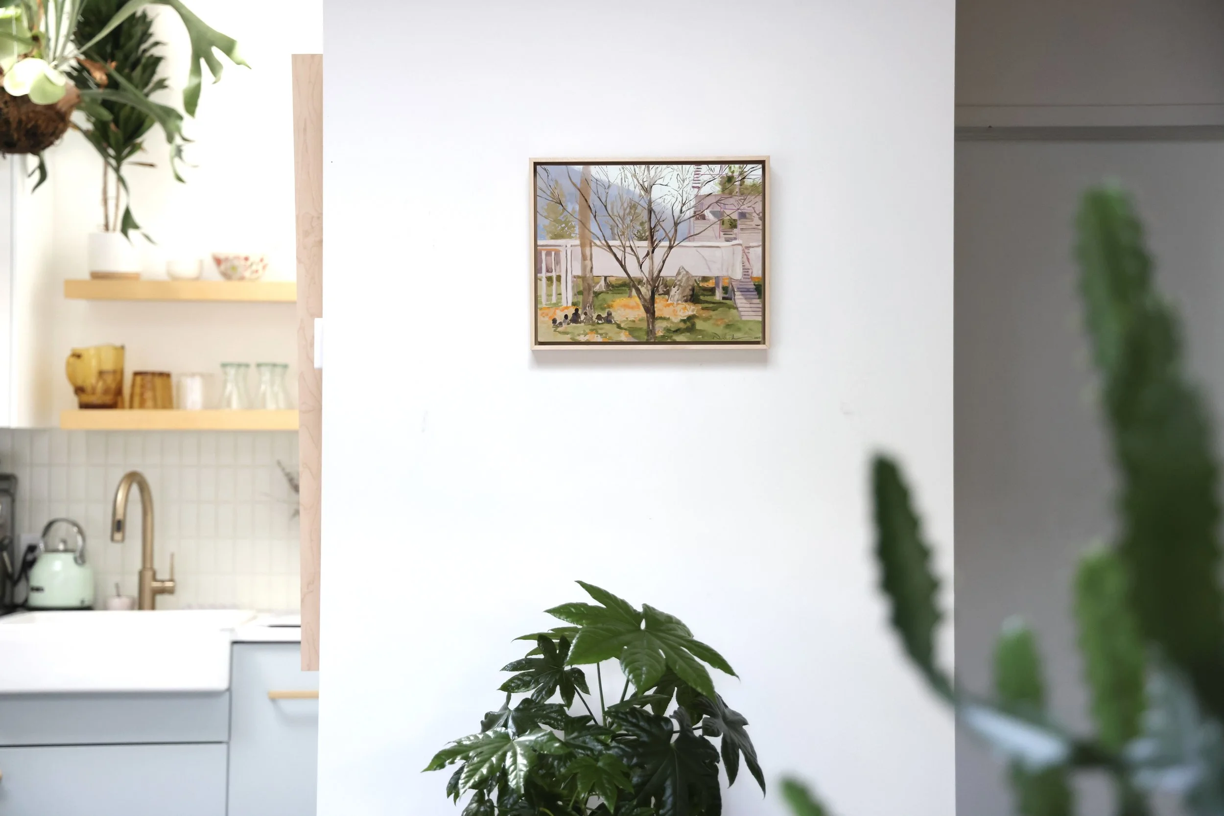 The paintings themselves offer depictions of signs of human life. Wherever humans are, built elements exist. The best of design draws on the form of the landscape around it to enhance the structure’s presence and function, thus the scenes in each attempt to do the same. There is also a sense of play in these artworks as I largely allowed the composition to unfold during the painting itself instead of relying on a well-formed plan made before setting my sights on the panel (my typical practice). They are all quite small, which was purposeful in that I have an easier time being exploratory on small surfaces than on large ones. 7 of the 9 paintings are finished in ornate, vintage-like frames that provide a stark contrast to the contemporary landscapes that play out on the panels themselves. Each is a world within itself, not much informed by the painting that came before or after it. They are, perhaps, an exercise in raw creativity - a process that I very much needed at this time in my life.”