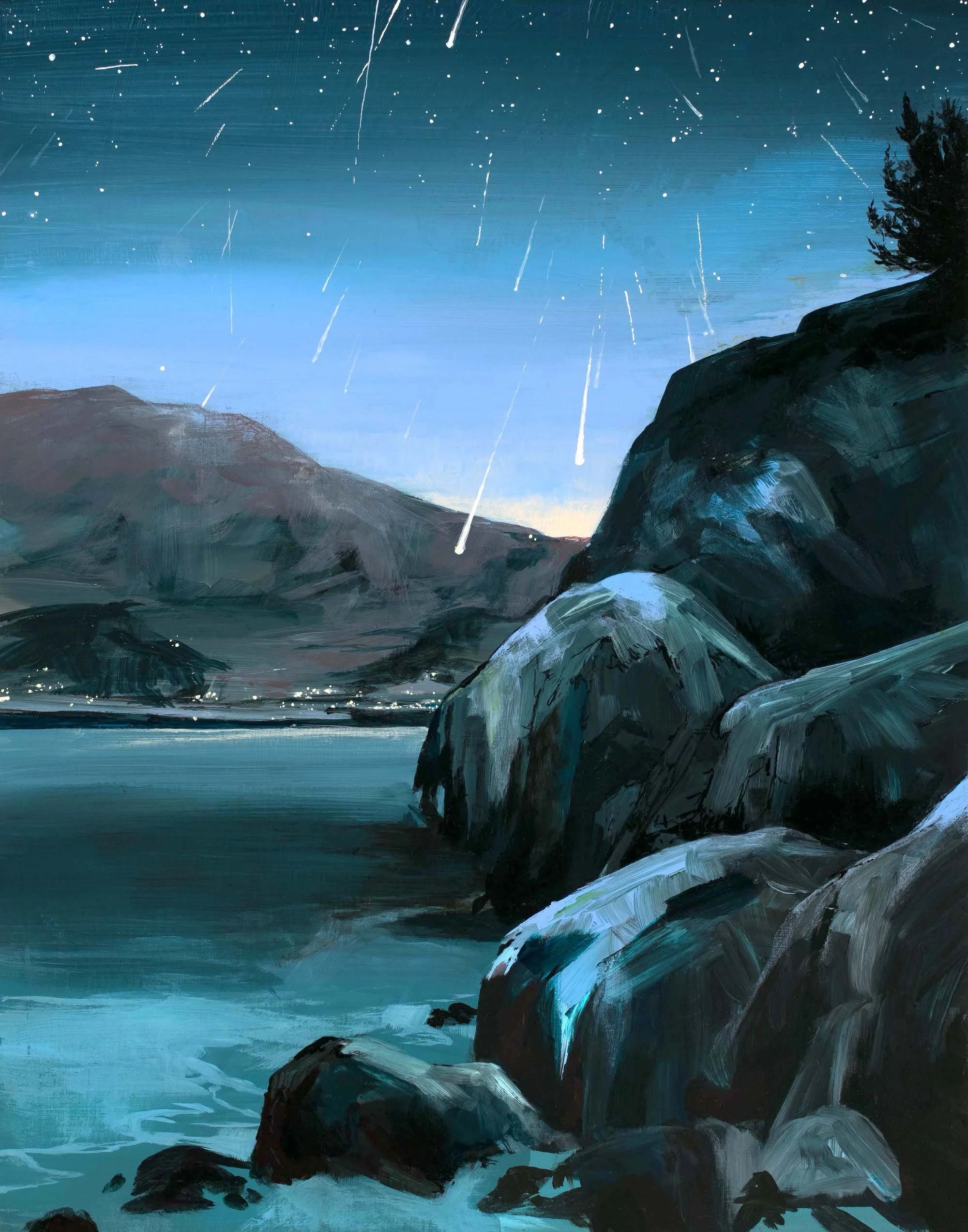 Meteors burn up in our atmosphere above a dusky coastline in this whimsical little scene. Nothing to do with climate change, but the heat created by these space rocks as they near the Earth’s surface make for a beautiful sight.