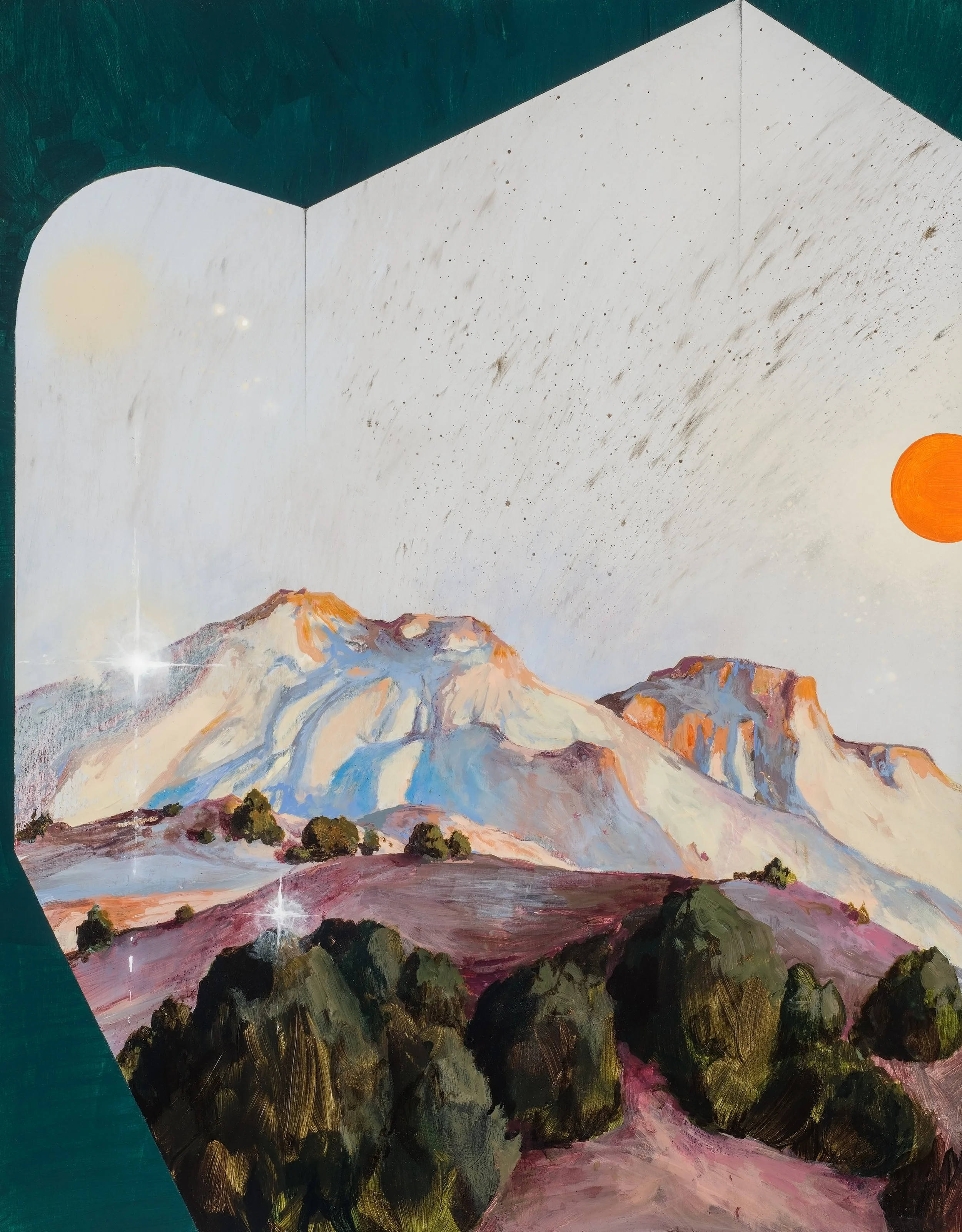 Southwestern mountain formations gleam under an ochre sun. I crowd-sourced the title for this one, thank you to Kimberly Glecos for the winning suggestion! I loved the Peter Pan reference in the the title “Straight On Till Morning” as I wanted the twinkling points to make the viewer feel like they had been transported to a distant location that feels a bit like a fairy tale.