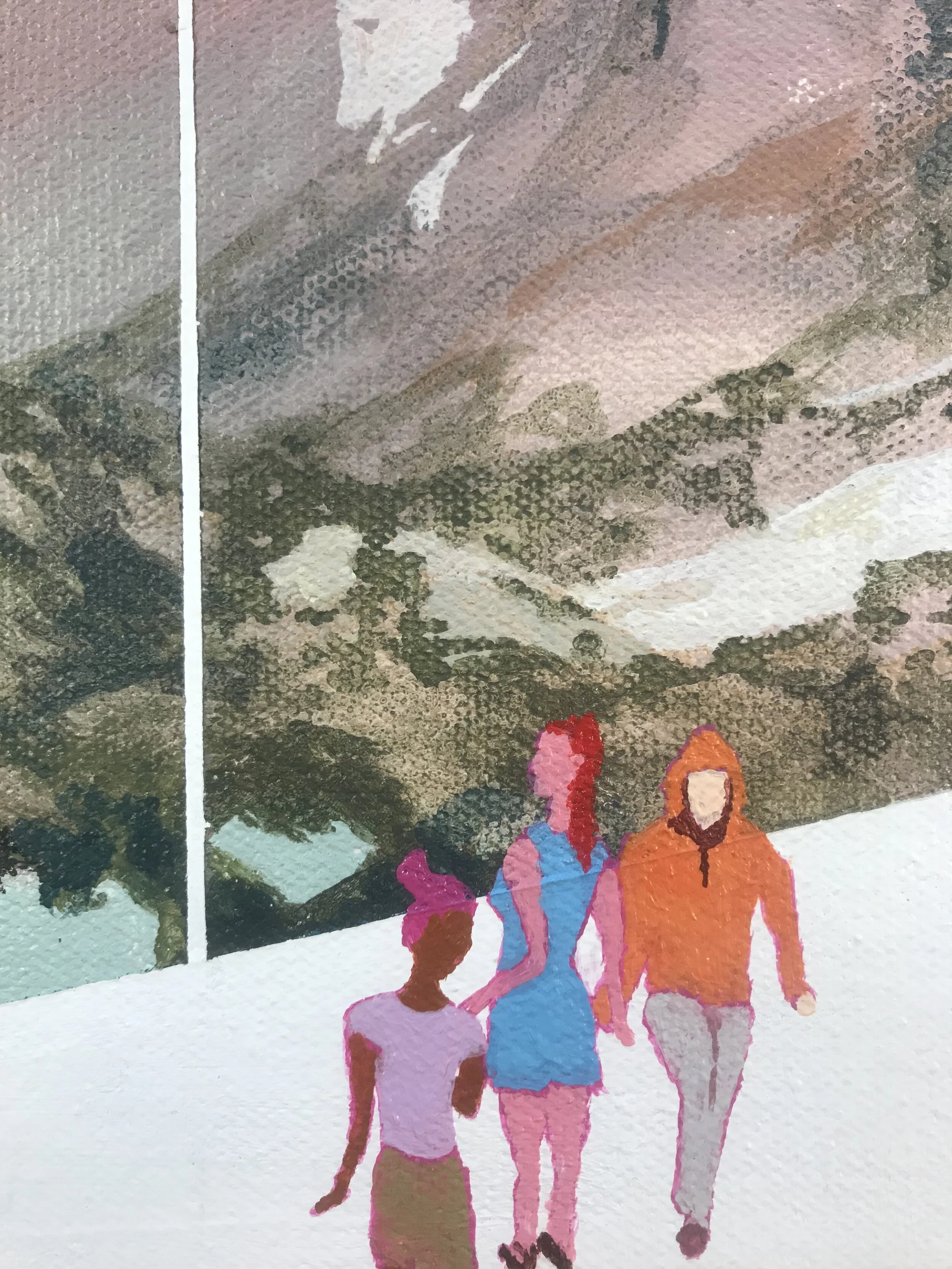 In contemporary times we visit barren, cold, beautiful places that we may not have been able to do access/experience in the past, but we do it with the pleasantries provided by modern technologies. In this context, the figurative structure containing the figures is symbolic of the gear, the planning, and the escape back into urbanity that accompany an expedition into this wilderness area. This relationship to the outdoors is just part of modern life, and part of what defines modernists these days for better or for worse. These pleasantries include gear, smartphones, motor vehicles, televisions, bottled oxygen.. the list goes on. Luckily, these technologies also enable more people to experience the great outdoors, which is I believe tantamount to fostering the reverence for nature needed to create a society who prioritizes its protection.